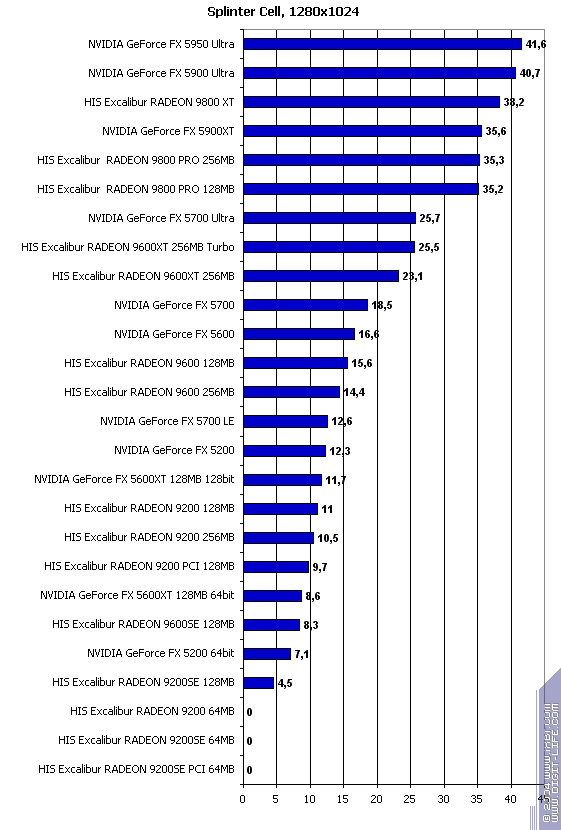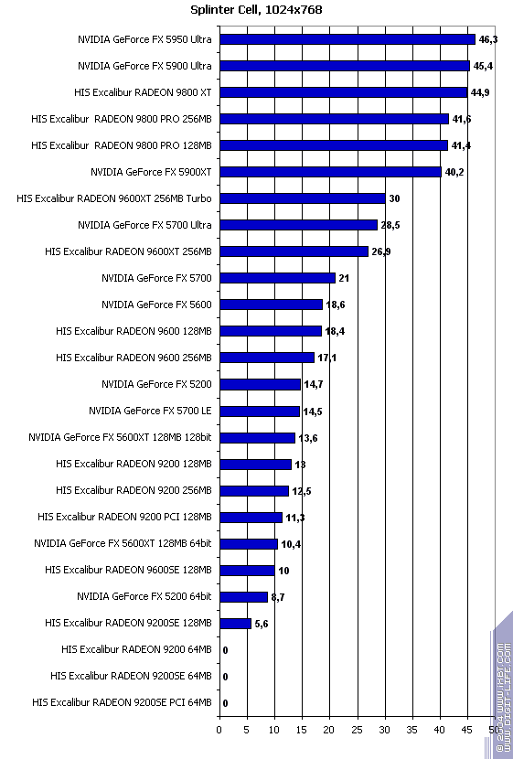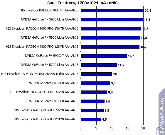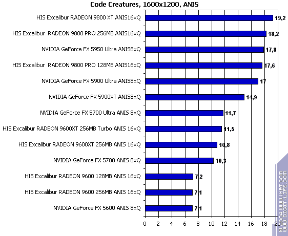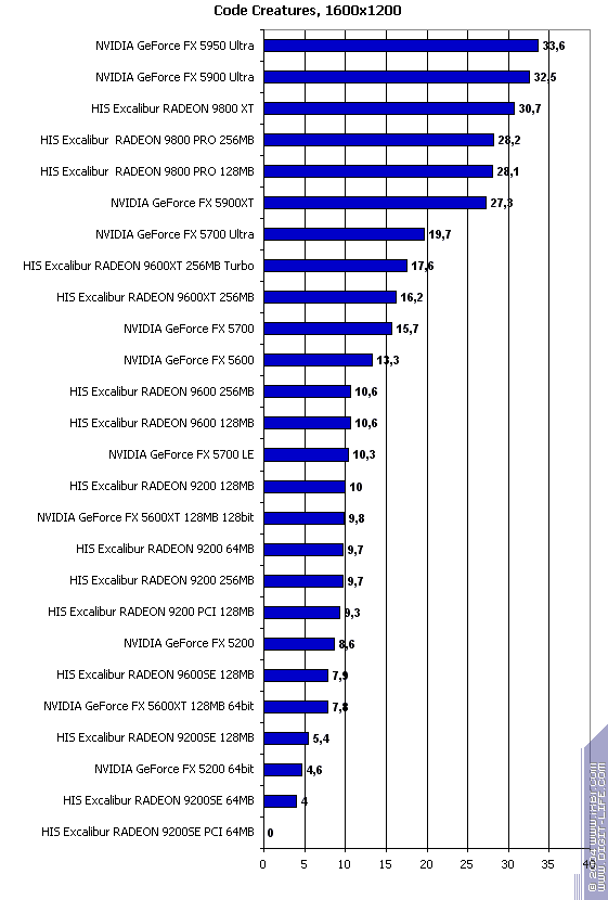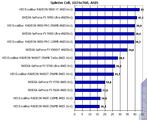 - HIS Excalibur RADEON 9600SE 128MB VIVO/Classic: урезание шины ради удешевления, увы, мало помогает популярности данной карты, ибо даже полноценный 9600 страдает от нехватки ПСП. Если два плюса: у карты без VIVO — низкий профиль, и изделие может вполне подойти тонким barebone-системам. У карты с VIVO, собственно, эта функция и является плюсом. Надеемся, что цена на такие карты будет адекватной их возможностям. Протестированные карты имеют хорошее качество исполнения, и работали стабильно.