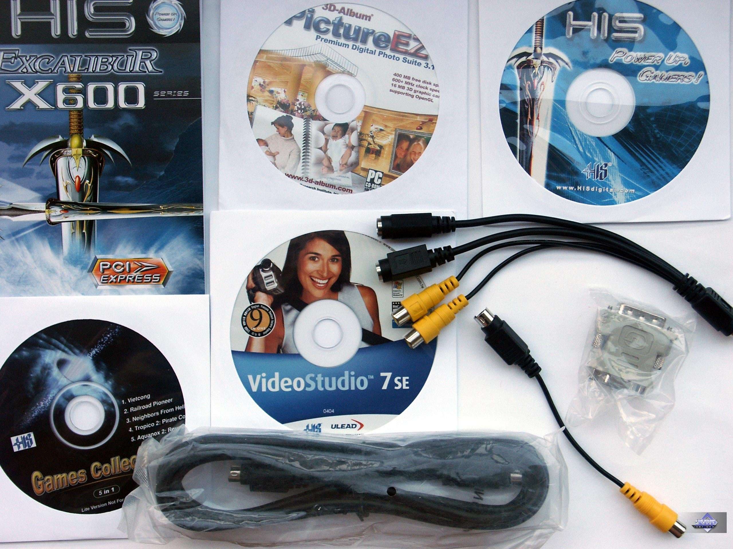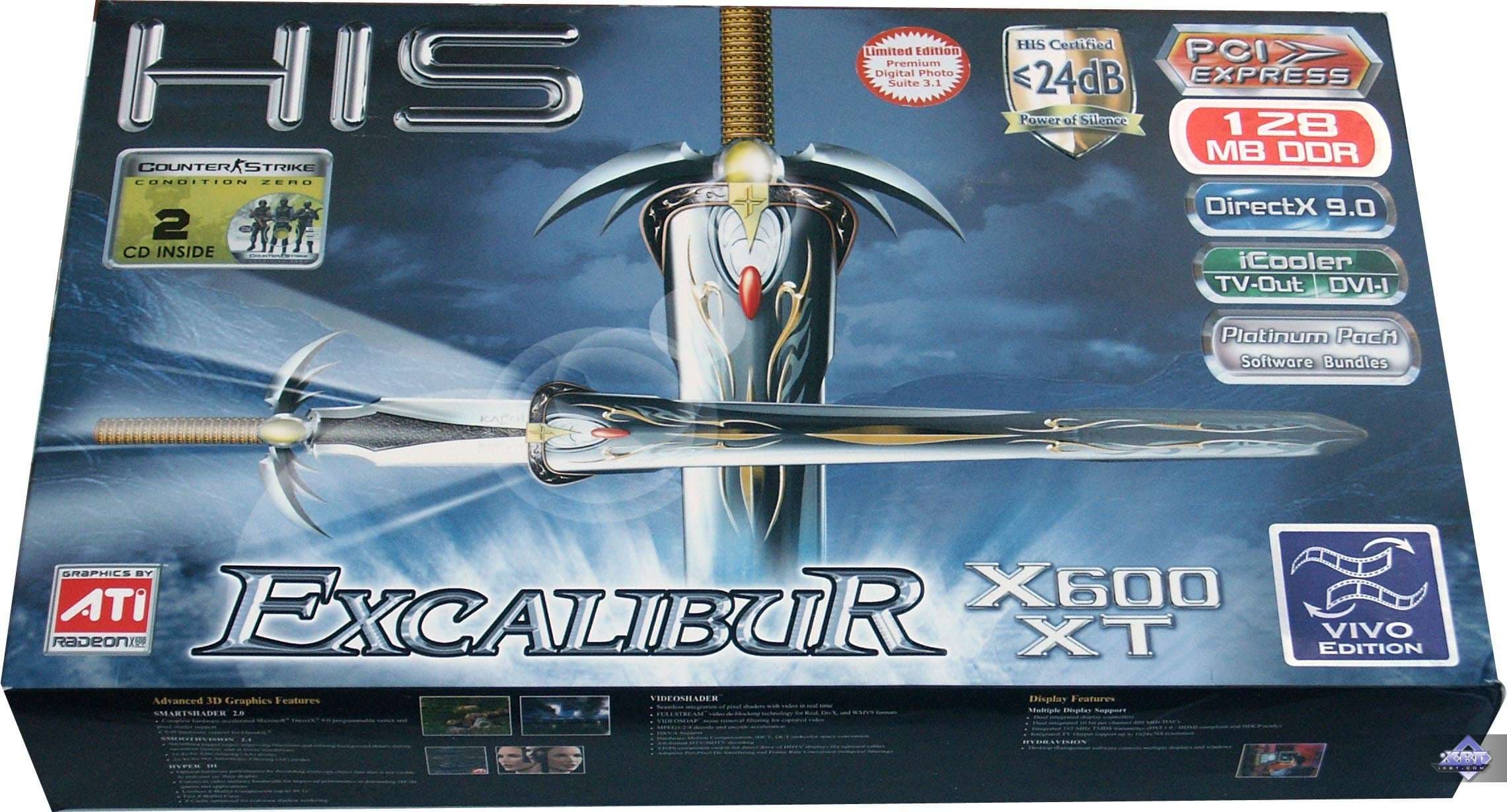 Видеокарта HIS Excalibur RADEON X600XT Limited Edition VIVO. Уже само название говорит о ее некоей эксклюзивности. Действительно, продукт поддерживает VIVO, чем выгодно отличается от своих аналогов у других производителей. На плате установлен особый кулер с подсветкой, но интерес вызывает не светодиод, а эффективность данного кулера, способного понизить температуру с разницей до 11 градусов по сравнению с обычным эталонным устройством охлаждения. И комплект поставки тоже отличается от регулярных комплектаций.