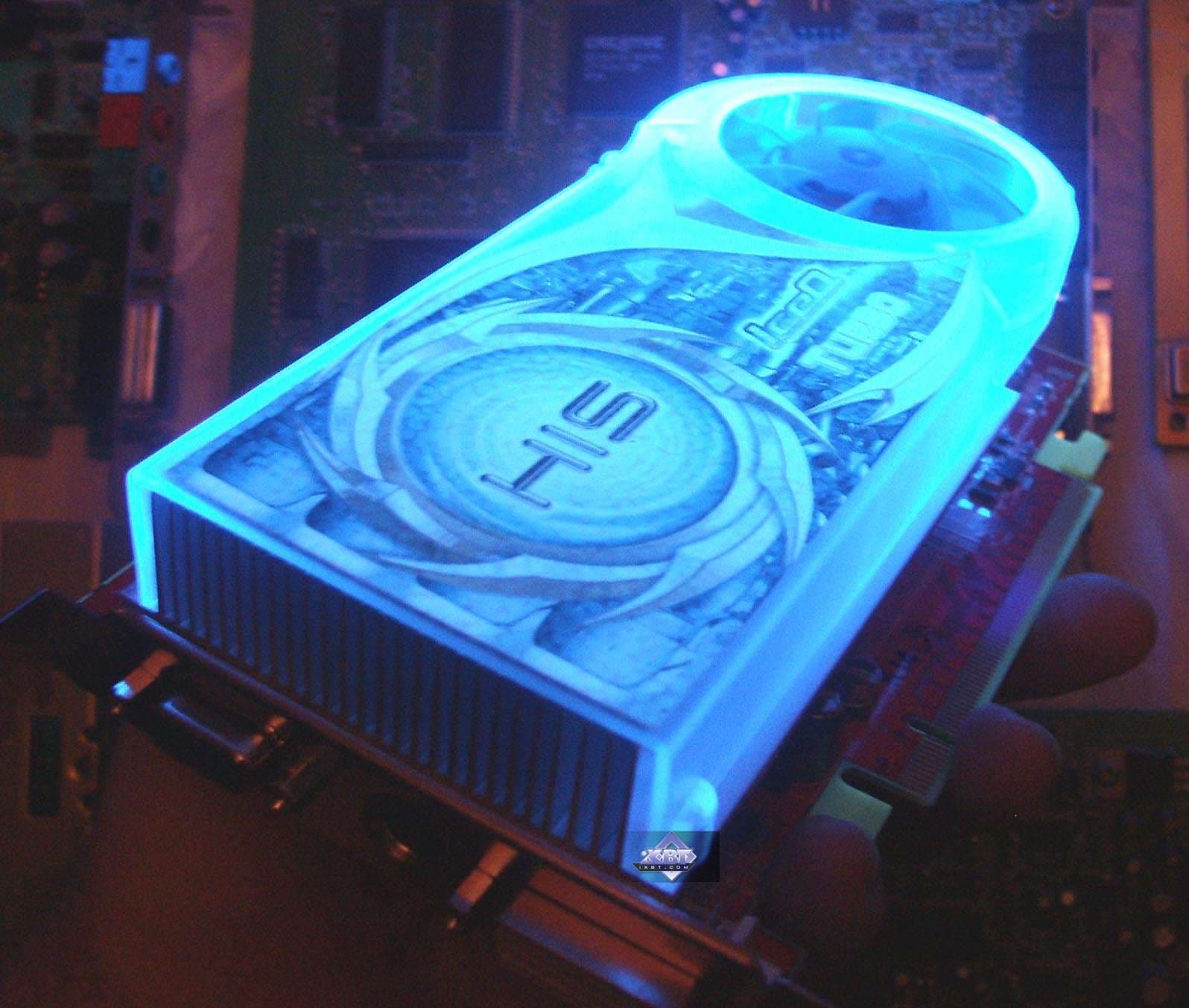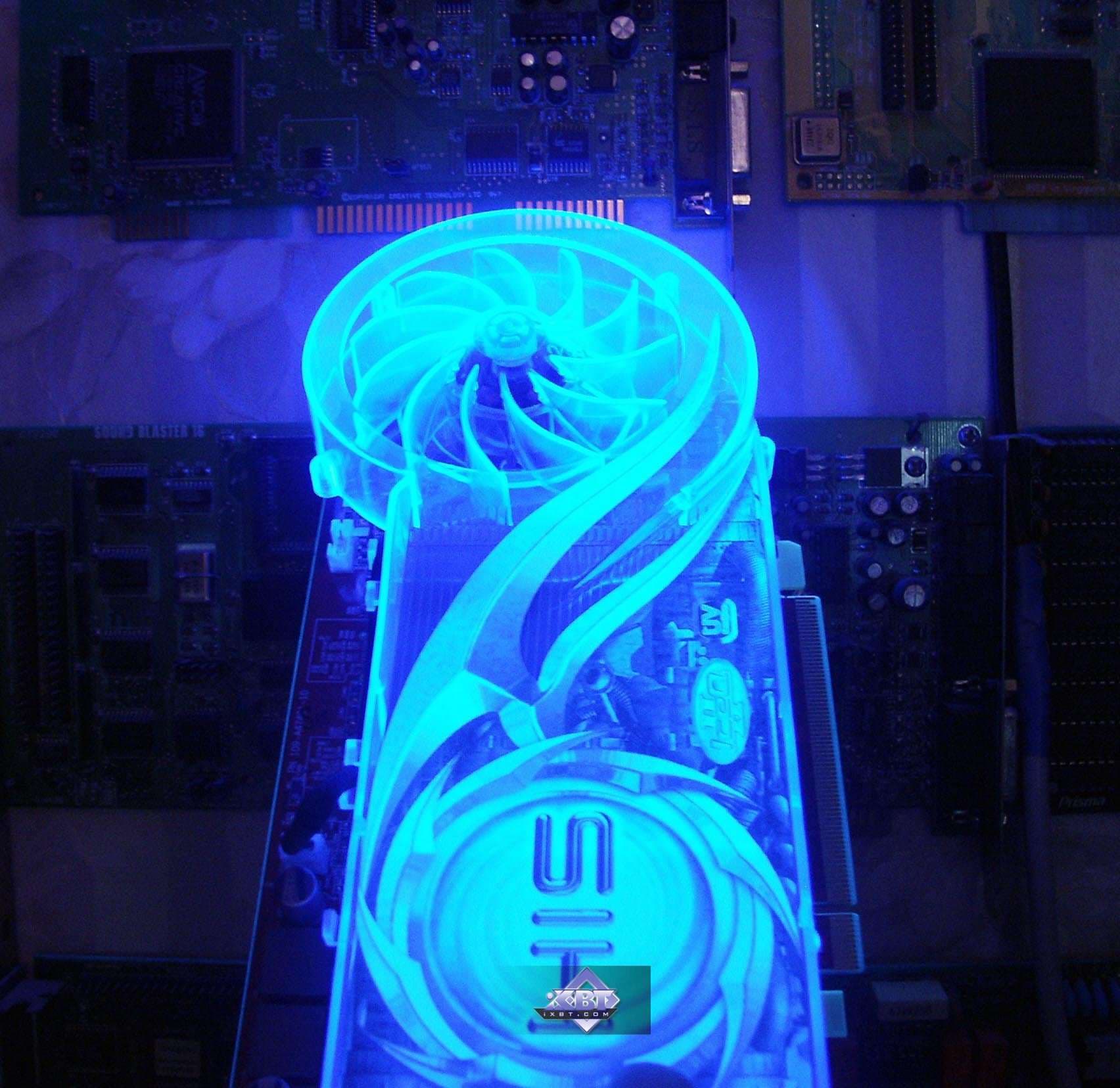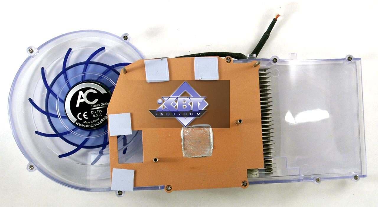 Фирменное устройство от Arctic Cooling. В принципе, такие кулеры можно купить отдельно, они продаются. Но в данной реализации от HIS имеется изюминка: прозрачный пластиковый кожух покрыт краской, светящейся в ультрафиолете (кстати, без ложной скромности могу сказать, что такой совет разработчикам дал ваш покорный слуга). Итак, кулер состоит из медного основания, прижимающегося к ядру и микросхемам памяти (через термопрокладки), к этому основанию припаян пластинчатый радиатор. Поверх последнего проходит пластиковый воздуховод (кожух), на одном конце которого турбина, закачивающая в него воздух, на другом — раструб, через который горячий воздух выбрасывается наружу из системного блока. Понятно, что воздух проходит через радиатор, охлаждая его. Уникальная особенность такой системы состоит в крайне низком шуме (очень грамотно продумана конфигурация турбины) при очень хорошей эффективности охлаждения. Частота вращения — от 2500 до 6000. Посмотреть видеоролик и оценить шум при старте системного блока можно по этой ссылке (1.3МB, AVI DivX 5.1). А также сравнить с фоновым шумом без видеокарты (740KB, AVI DivX 5.1). Разумеется, за эффективность и тишину надо чем-то платить. И такой жертвой является ширина системы охлаждения, при которой второй слот после PCI-E остается занятым. | ![]() |