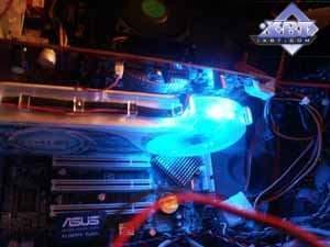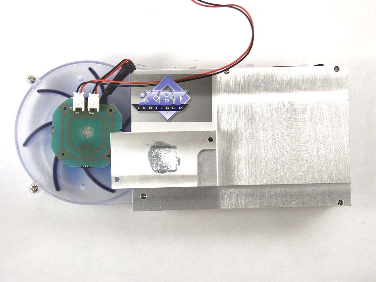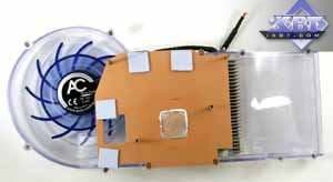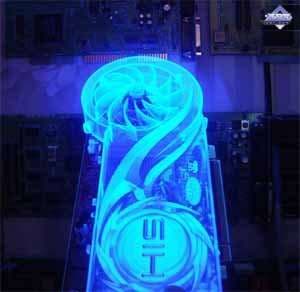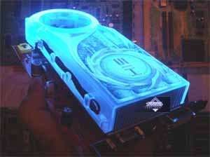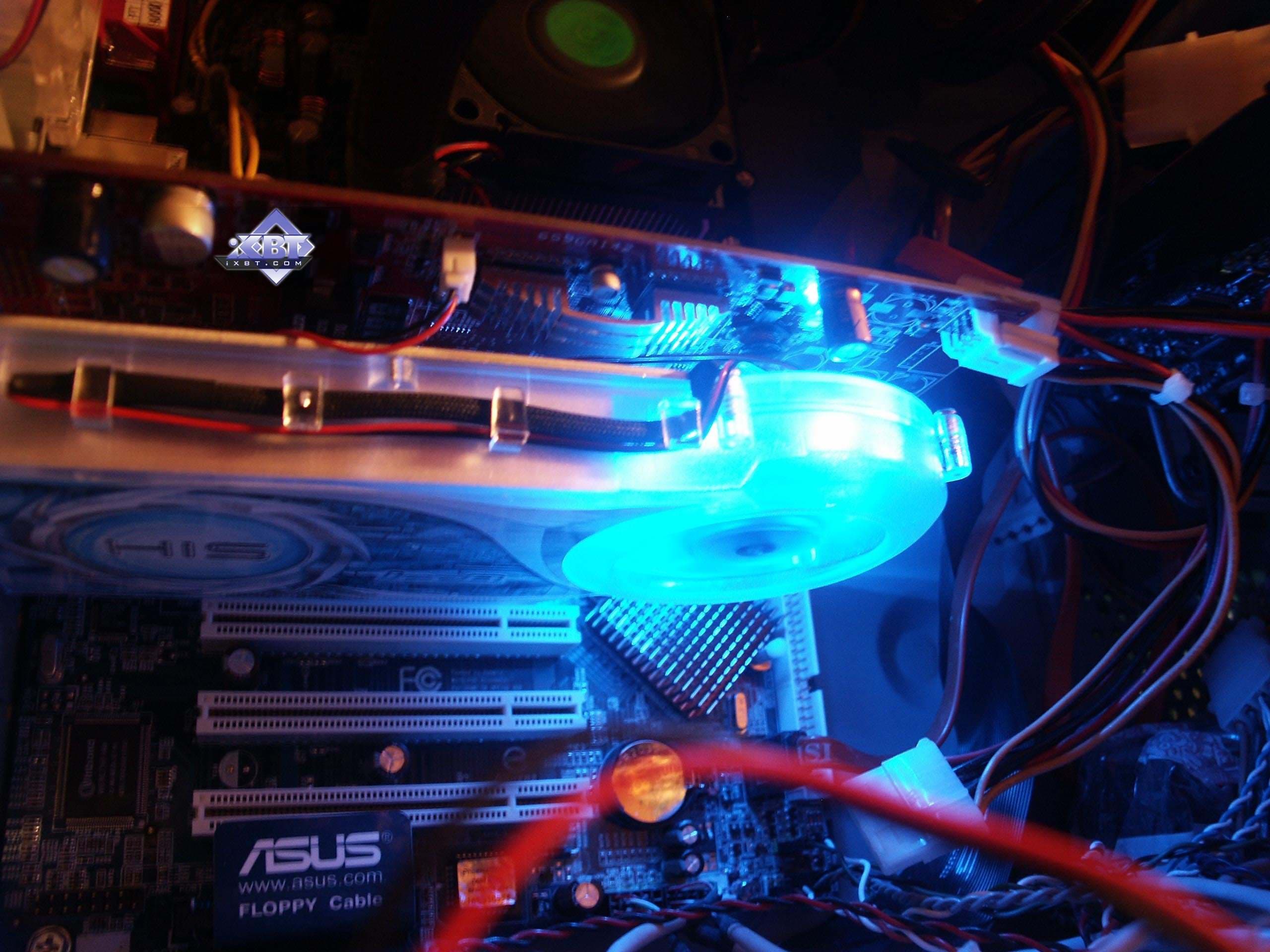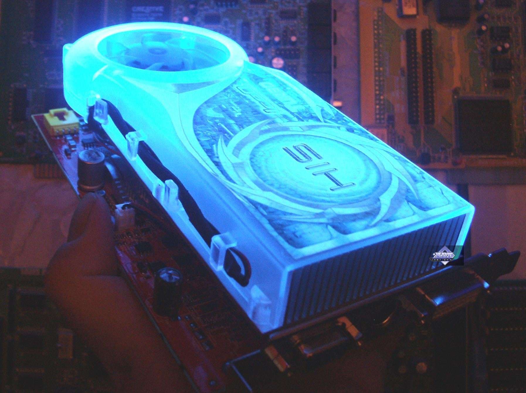 Фирменное устройство от Arctic Cooling. В принципе, такие кулеры можно купить отдельно, они продаются. Но в данной реализации от HIS имеется изюминка: прозрачный пластиковый кожух покрыт краской, светящейся в ультрафиолете (кстати, без ложной скромности могу сказать, что такой совет разработчикам дал ваш покорный слуга). Итак, кулер состоит из медного основания, прижимающегося к ядру и микросхемам памяти (через термопрокладки), к этому основанию припаян пластинчатый радиатор. Поверх последнего проходит пластиковый воздуховод (кожух), на одном конце которого турбина, закачивающая в него воздух, на другом — раструб, через который горячий воздух выбрасывается наружу из системного блока. Понятно, что воздух проходит через радиатор, охлаждая его. Уникальная особенность такой системы состоит в крайне низком шуме (очень грамотно продумана конфигурация турбины) при очень хорошей эффективности охлаждения. Частота вращения — от 2500 до 6000. Посмотреть видеоролик и оценить шум при старте системного блока можно по этой ссылке (1.3МB, AVI DivX 5.1). А также сравнить с фоновым шумом без видеокарты (740KB, AVI DivX 5.1). Разумеется, за эффективность и тишину надо чем-то платить. И такой жертвой является ширина системы охлаждения, при которой второй слот после PCI-E остается занятым. | ![]() |