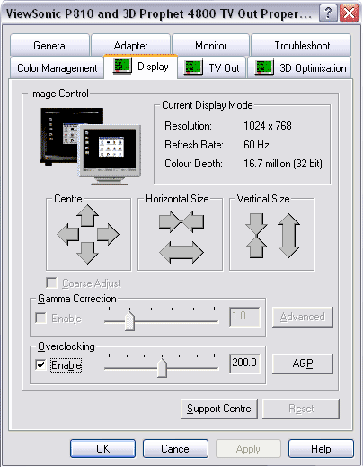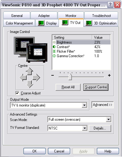 Настройки в драйверах позволяют регулировать не только форматом сигнала, но и геометрию картинки, а также цветовые решения. TV-out работает только в режиме дублирования картинки на монитор и на телевизор. Повторяю, что современные функции "двухголовости", к которым уже успели привыкнуть пользователи, тут не реализованы. Поэтому запустить фильм на телевизоре, а на рабочем столе продолжать работать — не получится.