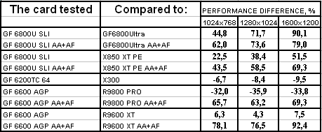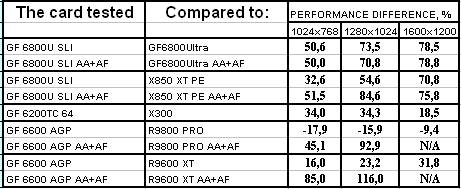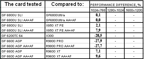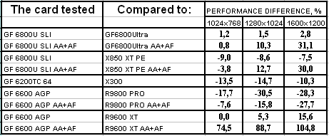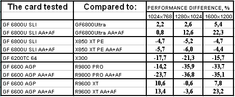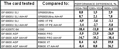Как можно догадаться, перевес над X850 XT PE у SLI благодаря тому, что одиночная карта GeForce 6800 Ultra смогла так опередить соперника.