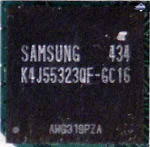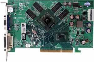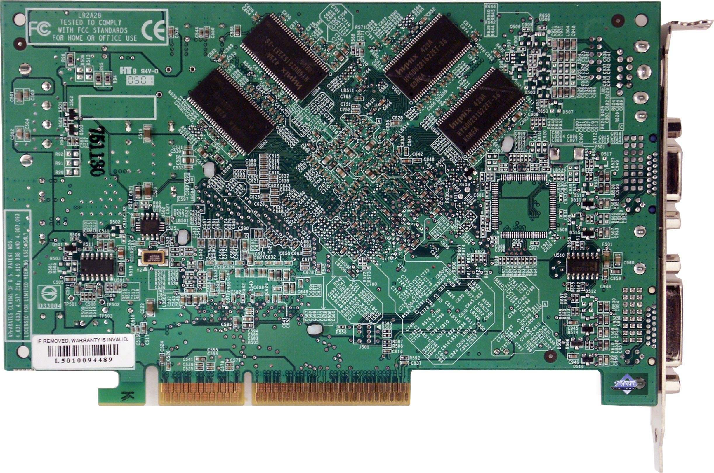 | Карта имеет 64 МБ памяти DDR SDRAM, размещенной в четырех микросхемах на лицевой и оборотной сторонах PCB (вместе с системным ОЗУ суммарный объем памяти — до 256 мегабайт) Микросхемы памяти Samsung. Время выборки у микросхем памяти 3.6 ns, что соответствует частоте работы 275 (550) МГц. | ![]() |