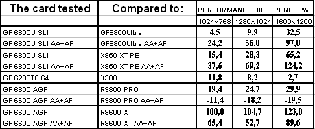 GeForce 6600 AGP продемонстрировал сильное отставание от 9800PRO (впрочем, он и дешевле), однако из-за того, что драйвера ATI резко снизили скорость у последнего в режимах с АА+АФ, продукт Leadtek завоевал первенство. Да и относительно 9600XT карта выступила прекрасно.