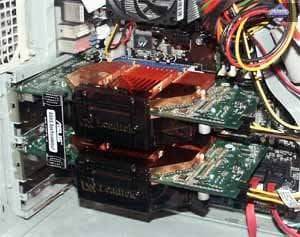 То есть радиатор с задней стороны нижней карты упирается в радиатор верхней карты, и примерно миллиметров 5 не хватает для того, чтобы карты смогли установиться вместе в системную плату, где между PCI-E x16 всего 1 слот. На сегодня существует только одна материнка, где такие слоты разнесены между собой дальше: это ASUS A8N-SLI: