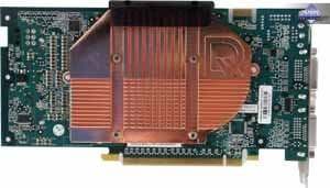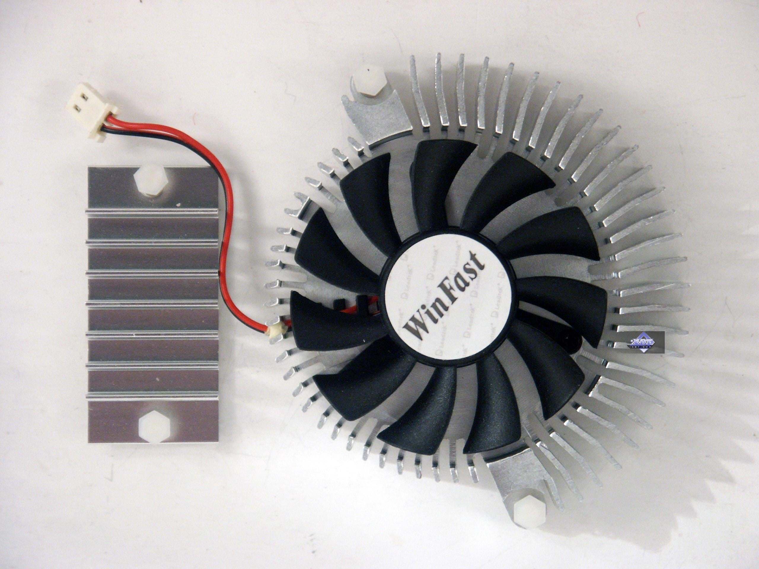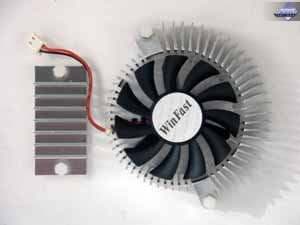 Система охлаждения также состоит из двух частей, но иных: большого радиатора и малого. Большой вместе с вентилятором в центре установлен на лицевой стороне карты. Это массивное устройство из медного сплава (поэтому его вес около 600г), по толщине занимает два слота, сверху и с лицевой стороны закрыт защитным полупрозрачным пластиком с решеткой в том месте, где вентилятор. Малый радиатор не имеет вентилятора и установлен на обороте карты, призван помогать в охлаждении самой PCB, особенно в местах, где на лицевой стороне установлены микросхемы памяти. Изготовлен также из медного сплава, поэтому суммарно видеокарта весит около 1 кг. Частота вращения вентилятора — от 3500 до 6000 оборотов в минуту, стартовый шум весьма сильный. Однако он утихает, и обороты снижаются только после 3-4-х минут работы системного блока и снова вырастают при нагреве (работе в 3D). Посмотреть видеоролик и оценить шум можно по этой ссылке (4.3MB, AVI DivX 5.1). А также сравнить с фоновым шумом без видеокарты (740KB, AVI DivX 5.1). | ![]() |