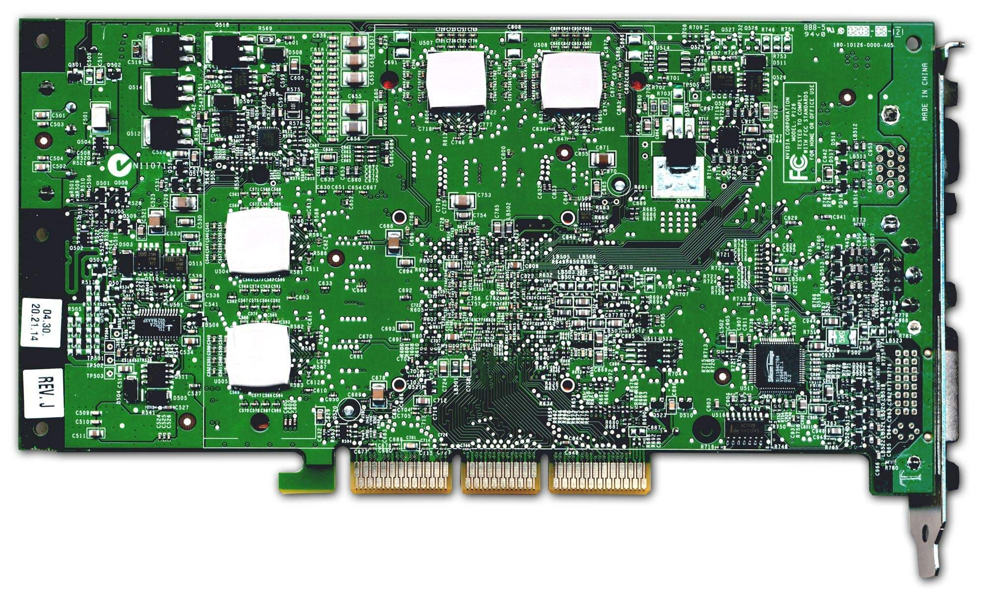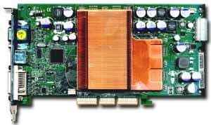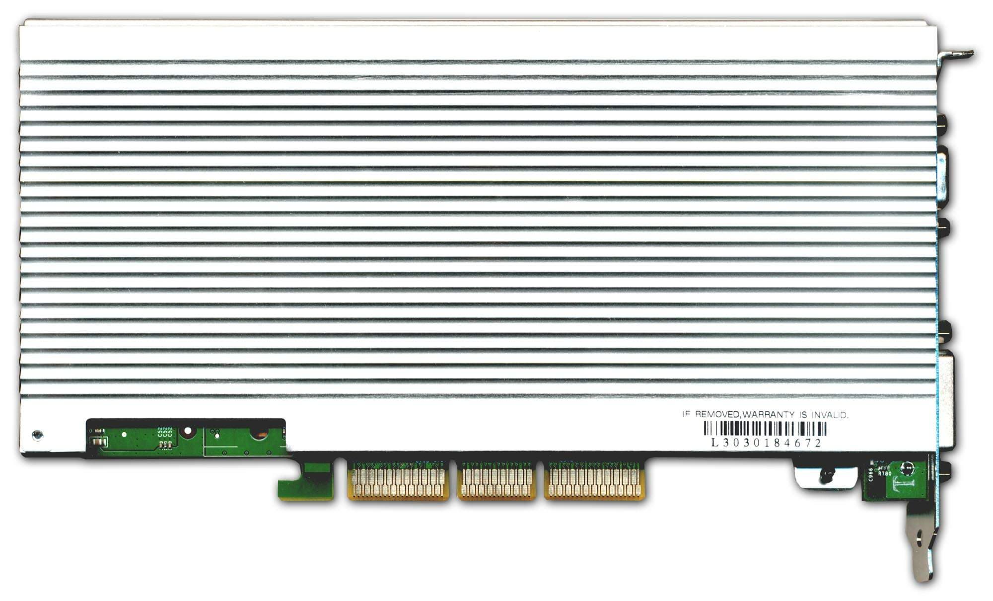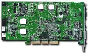 Карта основана на AGP X2/4/8 интерфейсе, имеет 128 мегабайт DDR II SDRAM памяти, расмещенной в 8-ми микросхемах по обеим сторонам PCB. Интерфейс обмена с памятью 128бит. На карте установлены микросхемы памяти Samsung марки K4N26323AE-GC1K, форм-фактора BGA. Максимальная частота работы — 550 (1100) МГц, поэтому можно сделать вывод, что время выборки 1.8 нс. По умолчанию память работает в 3D на частоте 500 (1000) МГц, в 2D — 300 (600) МГц. | ![]() |