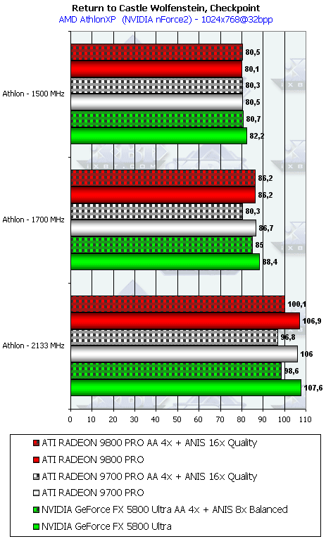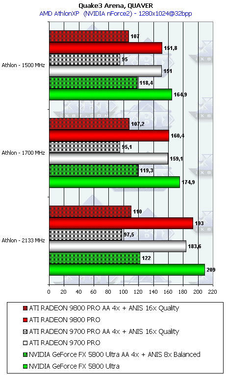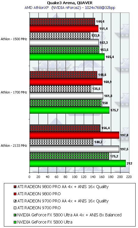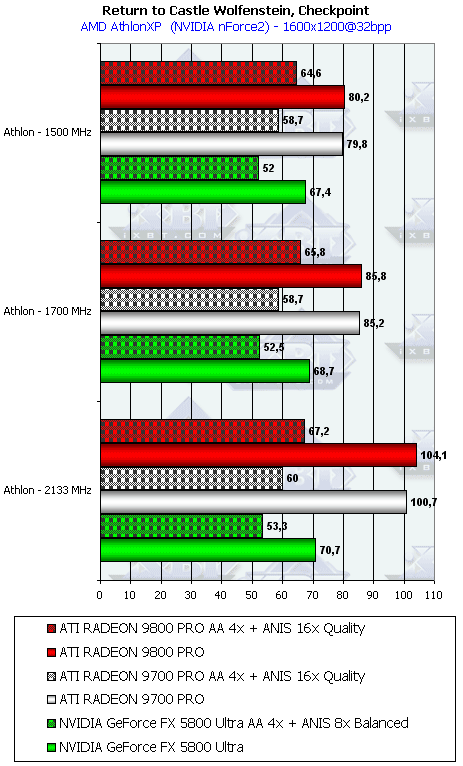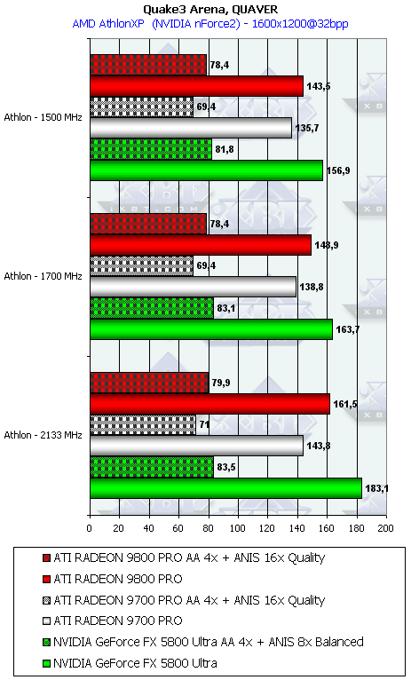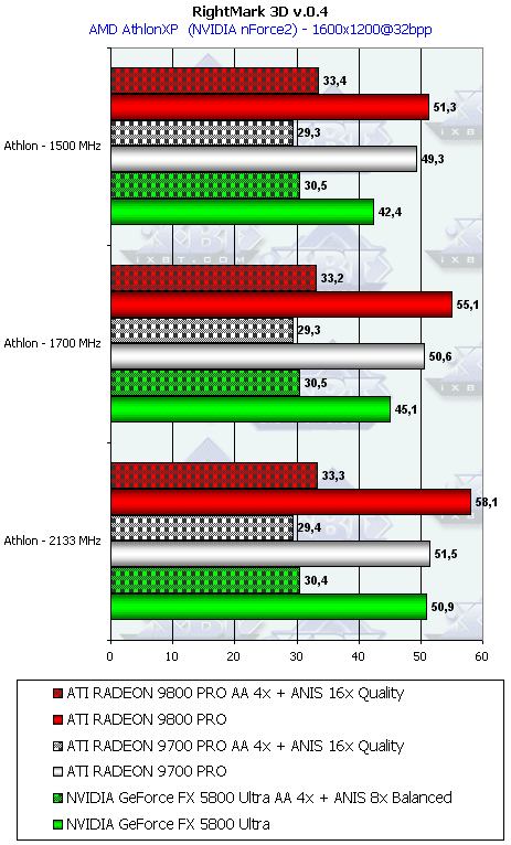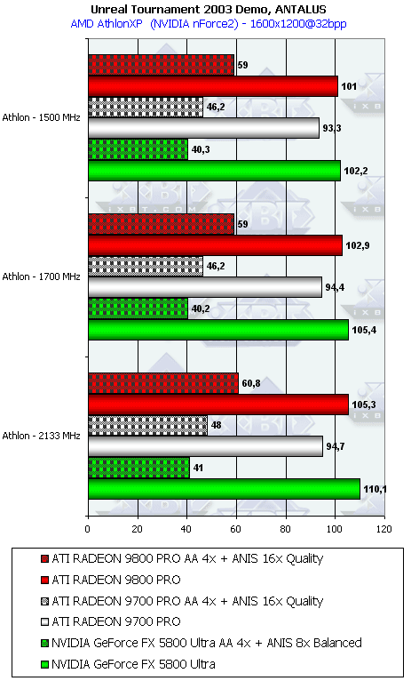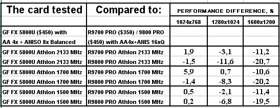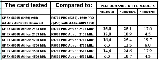 Прекрасно видно, что увы, GeForce FX 5800 Ultra терпит полное поражение от RADEON 9800 PRO. Разумеется, речь идет о тяжелых режимах с АА и анизотропией, а ведь главная цель нашего анализа сегодня. И это даже с учетом натяжек по ценам, когда стоимость NV30 взята условно $450 (а изредка попадающиеся карты в Москве на конец апреля имеют цену около $500), а цена на RADEON 9800 PRO образована на основании имеющихся цен на американском рынке плюс поправка на доставку и т.п. На деле расклад по ценам может быть и иным, и очевидно, что скорее всего не в пользу GeForce FX 5800 Ultra. Что касается зависимости производительности от частоты работы CPU, то процентные соотношения, приведенные выше, не требуют комментариев.