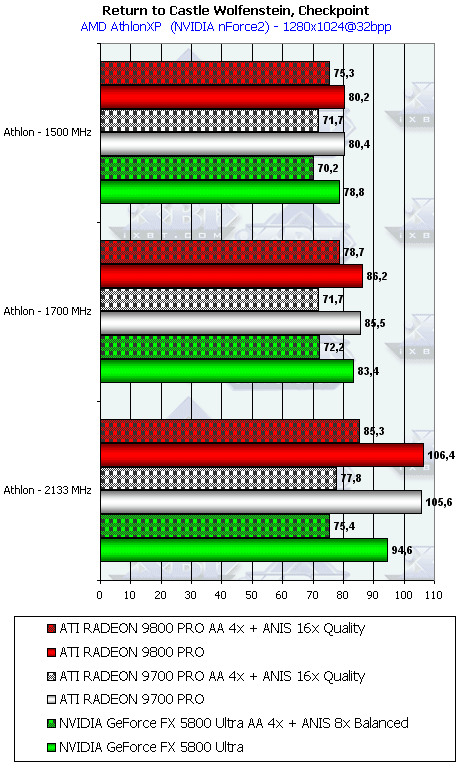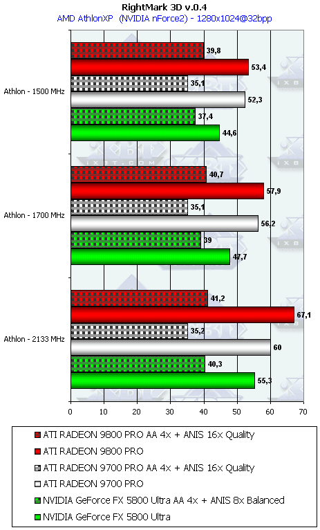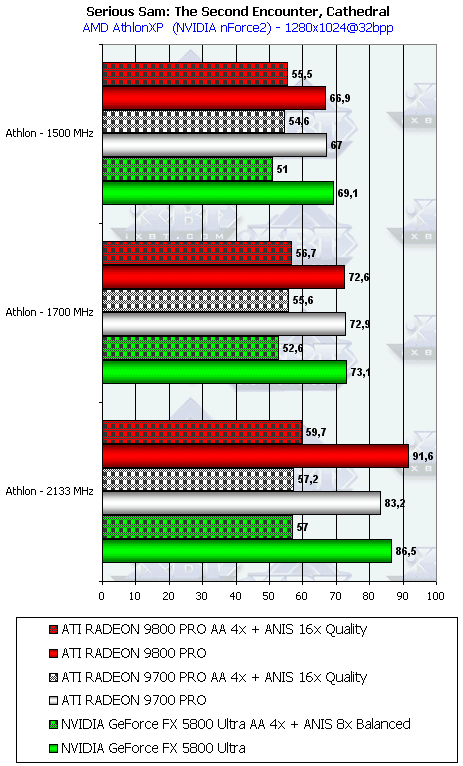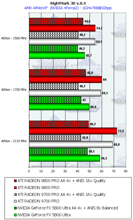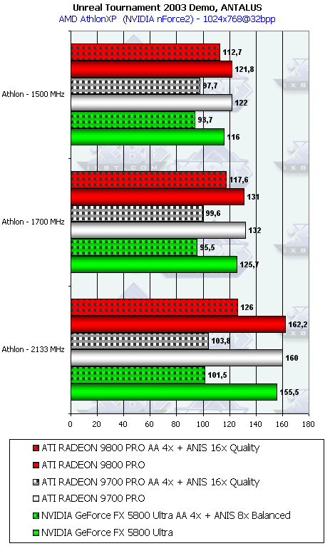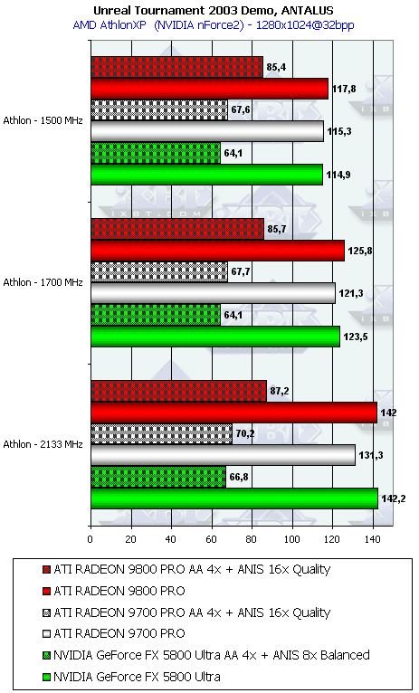 - Исследование зависимости производительности GeForce FX 5800 Ultra от частот работы CPU на примере AthlonXP при сильной нагрузке карты АА и анизотропией;