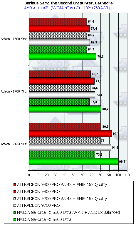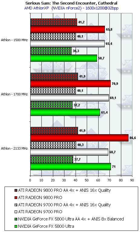 - Serious Sam: The Second Encounter v.1.05 (Croteam/GodGames) OpenGL, мультитекстурирование, Grand Cathedral demo, настройки тестирования: quality, S3TC OFF