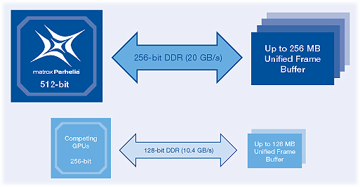 Итак, по сравнению с предыдущим поколением ускорителей, вдвое увеличится пропускная полоса локальной видеопамяти. Но скорость не главный конек продуктов от Matrox. На удивление, чип Parhelia-512 не оснащен какими-либо технологиями экономии пропускной полосы памяти. Этот факт удивителен подобные технологии присутствуют во всех последних продуктах от ATI и NVIDIA, но видимо Matrox решила ускорить и удешевить разработку чипа, являющегося для них скорее символом, чем попыткой завоевать рынок.