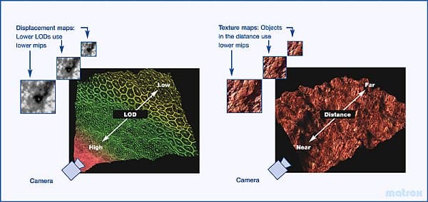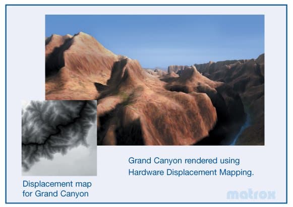 Лицензированная у Matrox Graphics Inc. (и, разумеется, реализованная в Parhelia-512) технология Displacement Mapping позволяет существенно увеличить степень реалистичности и детальности рельефных поверхностей. В отличие от привычных уже разновидностей рельефа, наносимого на поверхности треугольников при закраске и не влияющего на видимость тех или иных точек (картой рельефа моделируется только освещенность точки, а не ее реальное положение в пространстве) карты смещения позволяют создавать геометрически корректные рельефы, пересечение которых в пространстве не будет выглядеть идеальной прямой. Фактически эта технология модифицирует положение вершин треугольников, сдвигая их в направлении нормали к поверхности на величину, пропорциональную значению из специальной текстуры (карта смещения):