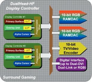 - Возможность вывода одного изображения, растянутого на два или даже три (!) приемника. Например, на 2 встроенных и один внешний RAMDAC или на оба встроенных RAMDAC и TV-Out. Суммарное разрешение в тройном режиме до 3840x1024x32bpp. Технологии TripleHead Desktop, Surround Gaming и DualHead-HighFidelity (HF)