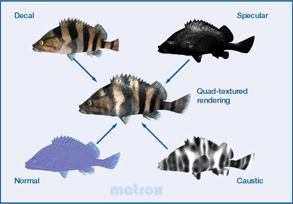 Кроме широкой шины и повышенной точности обработки данных, чипы нового поколения просто обязаны отличаться качественными и «недорогими» с точки зрения производительности антиалиасингом (АА) и анизотропной фильтрацией. У Parhelia-512 тут все в норме, если не считать маркетингового заскока с цифрой 64. На практике в наличии по четыре блока выборки билинейных значений, и гибко конфигурируемый интерполятор на каждом пиксельном конвейере (вернее было бы сказать один гибко конфигурируемый текстурный блок, способный выбирать четыре билинейных сэмпла, в том числе из различных текстур, за такт). Каждый такой блок может выбрать и интерполировать 16 дискретных отсчетов за такт (а всего, для четырех пиксельных конвейеров 64). Вот пример реального использования наложения четырех текстур за один проход: