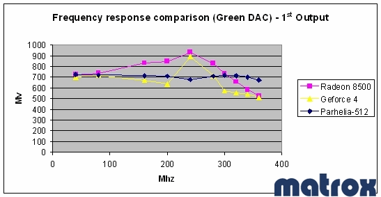 К слову о качестве RAMDAC. Matrox всегда славилась качественным 2D компания даже приводит результаты испытаний (!) частотной характеристики своих RAMDAC в сравнении с основными конкурентами. Первичный: