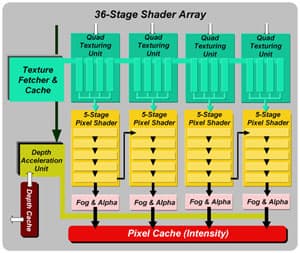 - Работают все четыре пиксельный конвейера, на каждом доступны 4 текстурных и 5 пиксельных (арифметических) шейдерных стадий.