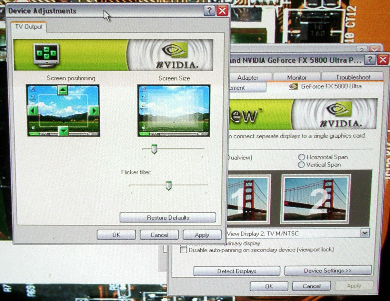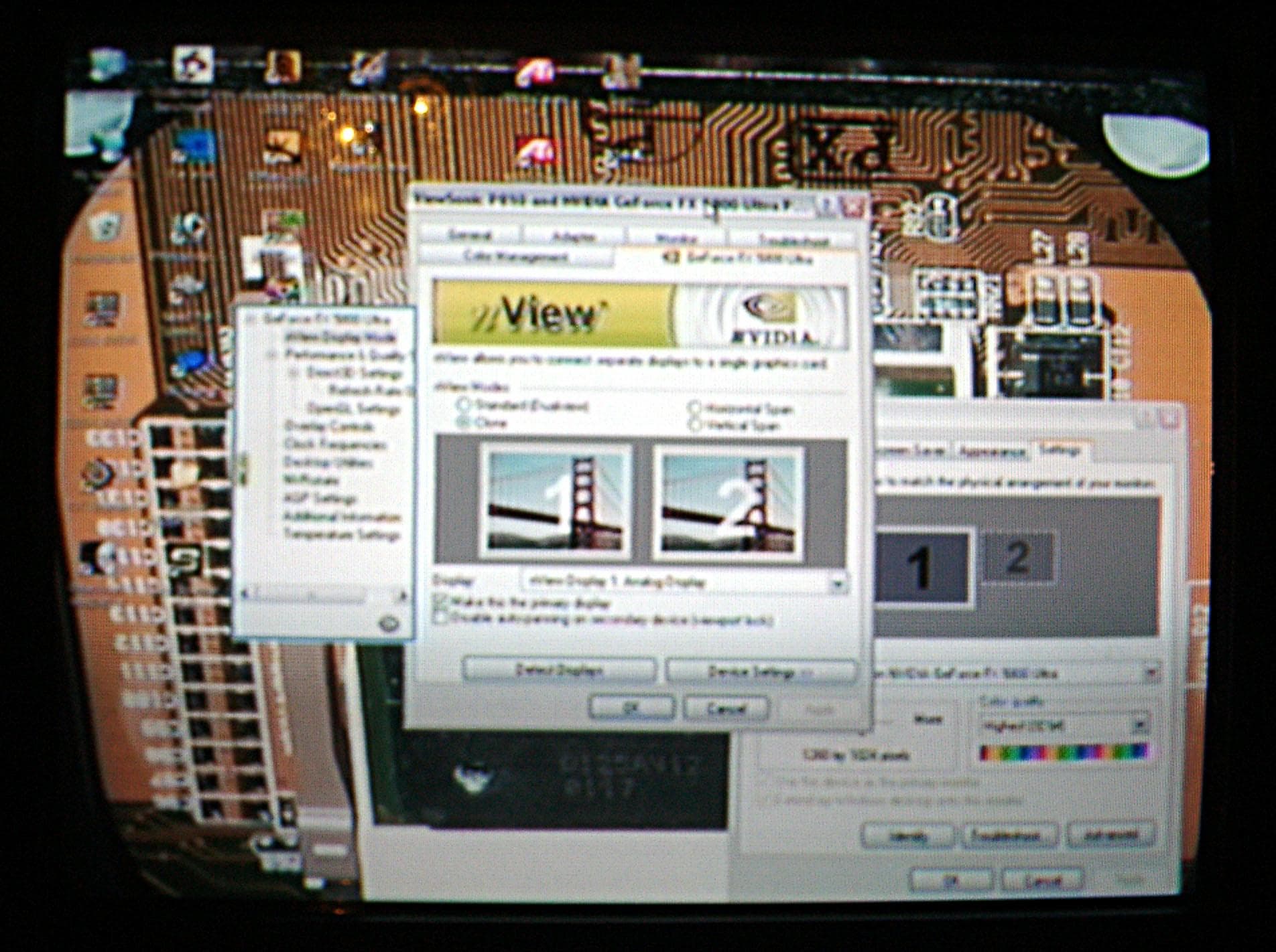 Итак, посмотрим, что даст нам ТВ-выход у данной карты. Прежде всего надо заметить, что активизация этой функции весьма легка, после присоединения всех кабелей при старте компьютера на телевизоре показывается копия того, что есть на мониторе вплоть до загрузки ОС. А вот уже потом телевизор гаснет, но зато на мониторе появляется меню nView, предлагающее всевозможные настройки двойного вывода изображения. В режиме Clone на телевизоре появляется копия экрана, причем, на моем ТВ Hitachi ничего настраивать и не надо, все умещается на экране без черных полей (разрешение 1024х768).