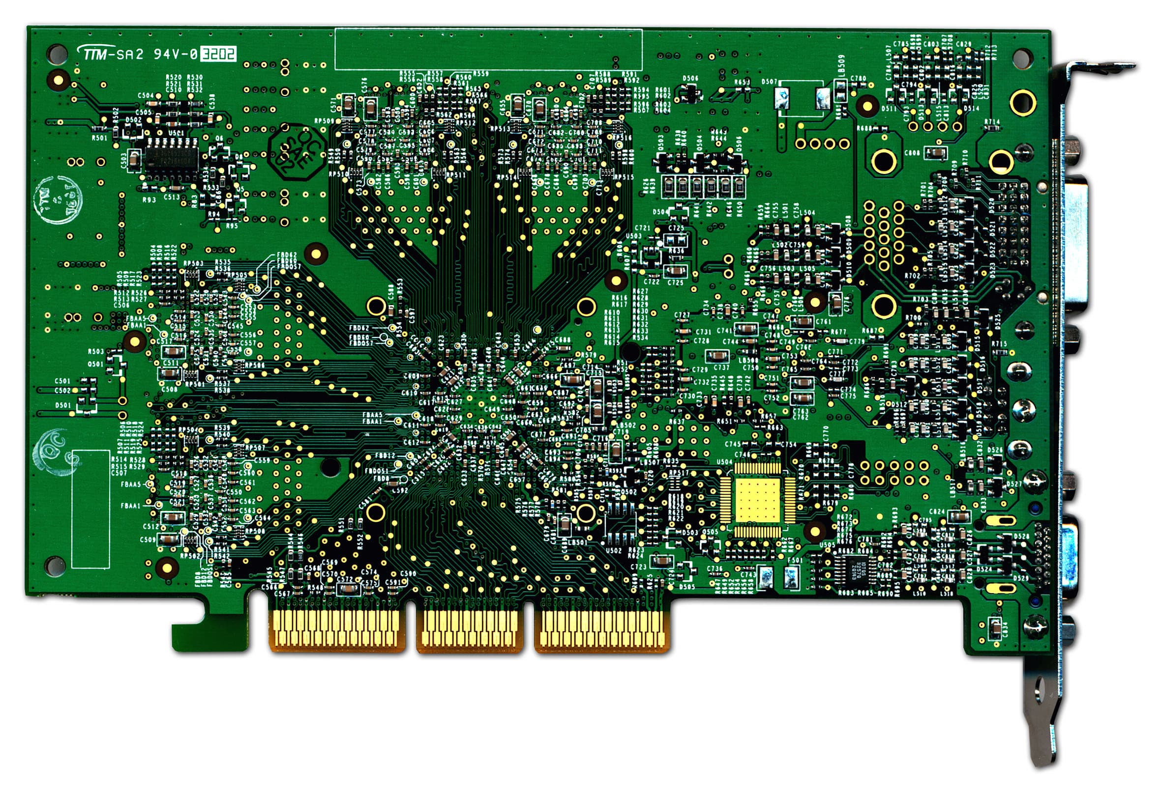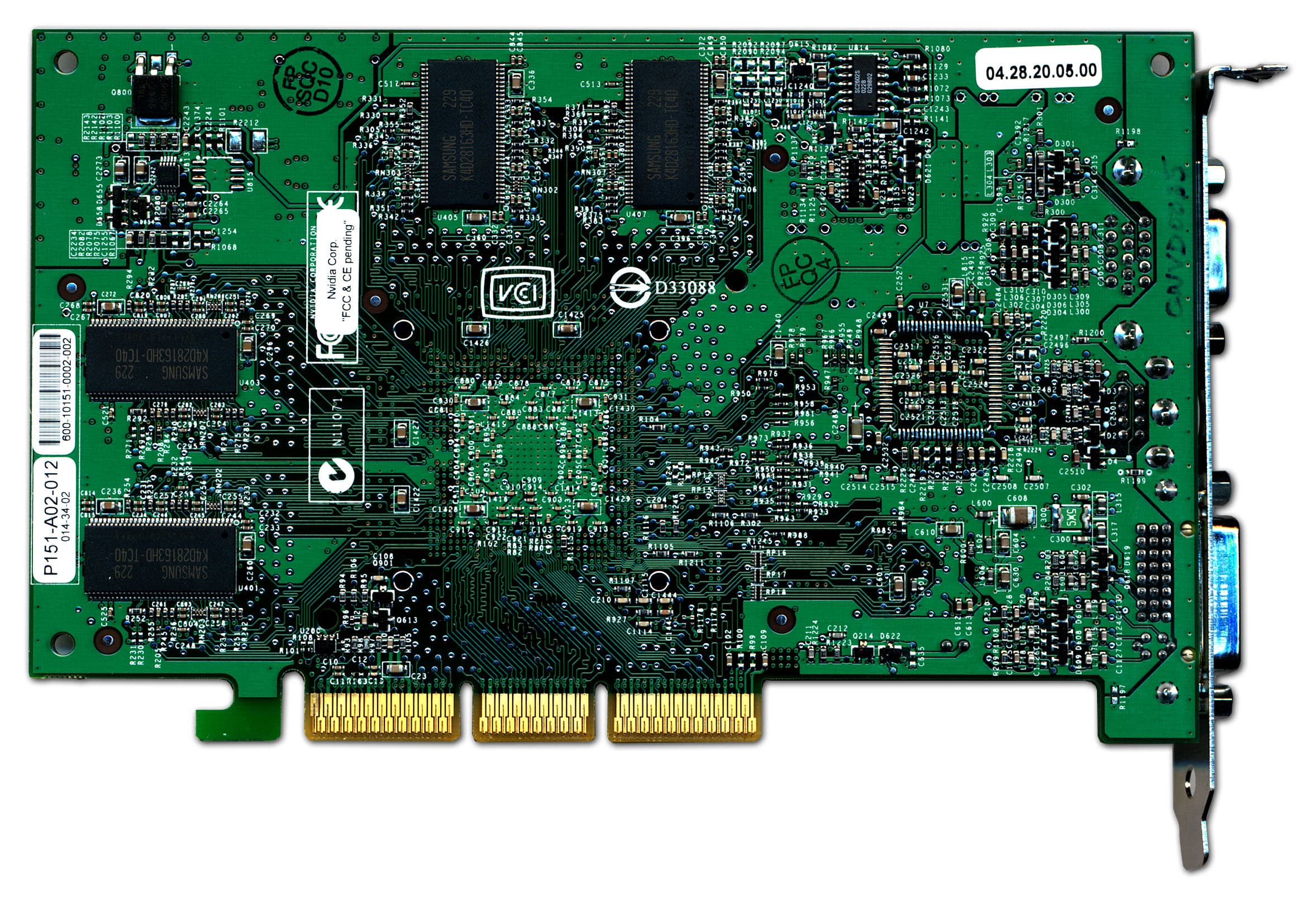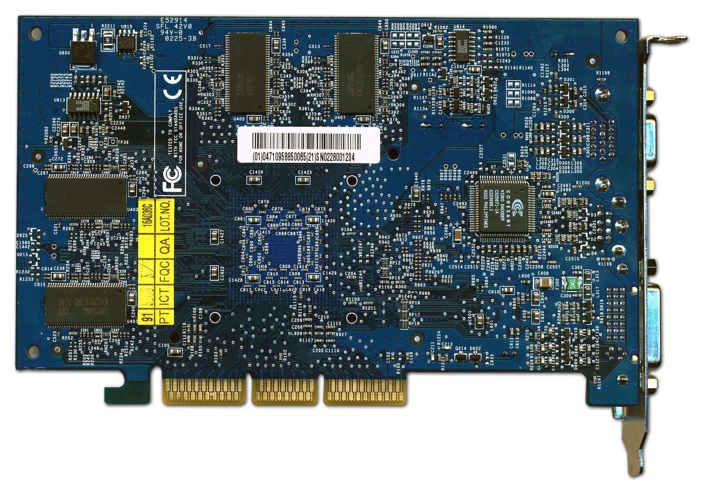 Как мы видим, если NV28 (в реализации Ti 4200) по-прежнему комплектуется обычными микросхемами памяти, то NV18 в реализации MX 440 представляет собой иную плату. Микросхемы памяти в BGA упаковке мы могли видеть только на картах MX 460, а теперь новые MX 440 with AGP8x также будут иметь такие модули. Мы видим, что эти микросхемы имеют время выборки 3.6нс, что обычно требуется для частоты работы памяти в 275 МГц, однако память тактуется на 256 МГц (раздолье для оверклокеров :-).