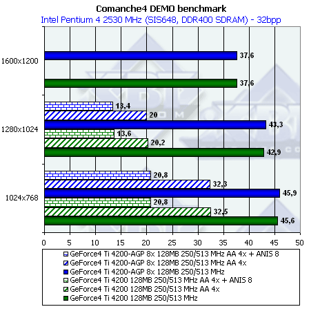 Любопытно отметить, что такой весьма процессорозависимый тест, как Comanche4, живо отозвался на более высокую пропускную способность по AGP, поэтому преимущество NV18 очевидно. Что касается NV28, то там все по-прежнему, разницы между NV28 и NV25 нет.
