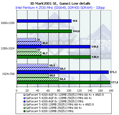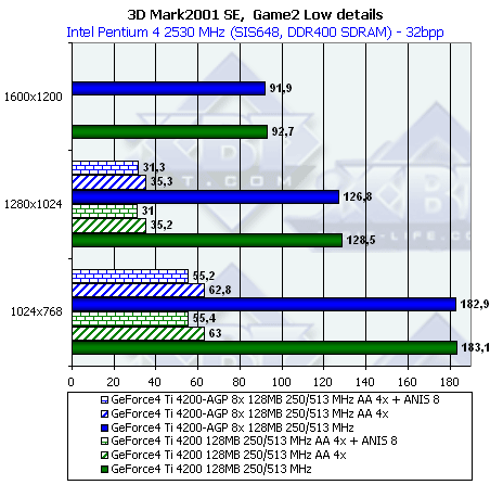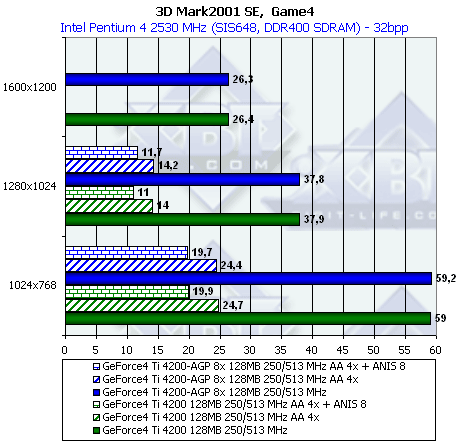Несмотря на то, что этот тест очень сложен, (он таковым и задумывался, чтобы проверить не только работоспособность современных ускорителей при активных функциях DX8.1, но и быстроту работы с ними), 128-ми мегабайт у GeForce4 Ti 4200 with AGP8x вполне хватает для всего и вся, поэтому никакой разницы между ним и Ti 4200 мы не видим.
