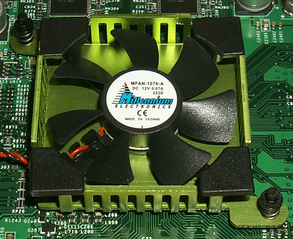 Перед нами тот самый кулер, что мы уже много раз могли видеть на reference картах из линейки GeForce3. Ничем особенным это охлаждающее устройство не отличается. Если его снять, то можно лицезреть и сам GPU: