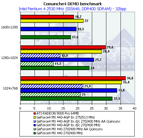Полагаю, что комментарии излишни. Единственное, что можно отметить — победу RADEON 9000 Pro даже над GeForce4 MX 440 with AGP8x, работающим на более высоких частотах по памяти.