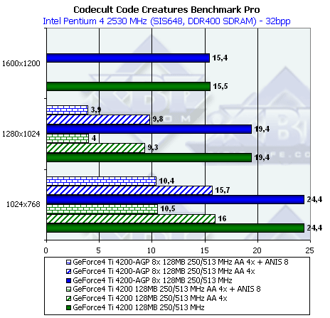 - Code Creatures Benchmark Pro (CodeCult) игровой тест, демонстрирующий работу платы в DirectX 8.1, Shaders, HW T&L.