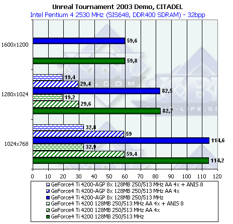 Интересно, что игры под OpenGL (кроме Quake3) более интенсивно используют AGP, и в данном случае мы видим, как NV18 выиграла сражение с MX 440, особенно в 1600х1200. Как и в случае Quake3, RADEON 9000 Pro проиграл соперникам, хотя выглядит много лучше, чем в том тесте.