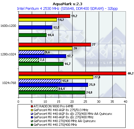 - А вот с случае с NV18 мы решили не только сравнить MX 440-8x на "старых 270/200 МГц" частотах с МХ 440, но и показать производительность MX 440 with AGP8x на его номинальных частотах 275/256 МГц. Прежде всего, из-за того, что в этом секторе у продуктов от NVIDIA есть сильный соперник в лице RADEON 9000 Pro, поэтому было весьма интересно узнать, сможет ли новый NV18 противостоять уже давно находяшемуся на рынке продукту от ATI. И выяснили, что подчас NV18 даже проигрывает. При этом не имея поддержки ни пиксельных шейдеров, ни EMBM, не говоря уж об анизотропной фильтрации высокого уровня.