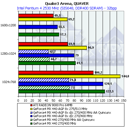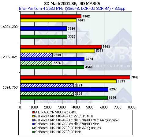 Картина почти аналогичная, за исключением того, что новый MX 440 сумел-таки обогнать RADEON 9000 Pro.