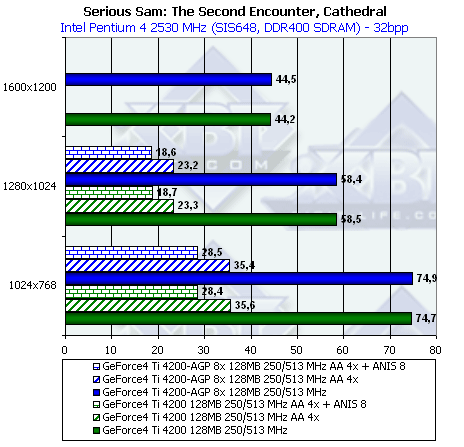 - Serious Sam: The Second Encounter v.1.05 (Croteam/GodGames) OpenGL, мультитекстурирование, Grand Cathedral demo, настройки тестирования: quality, S3TC OFF