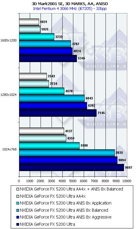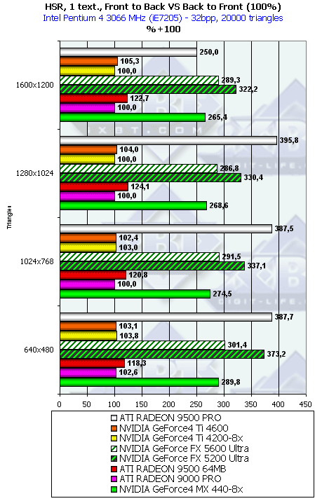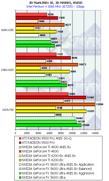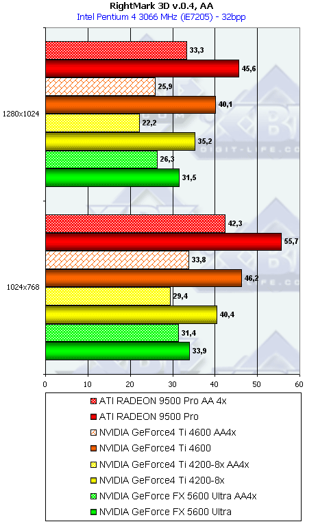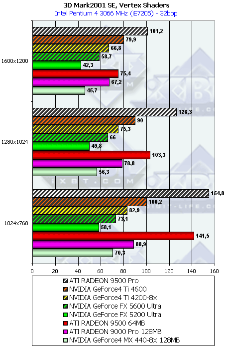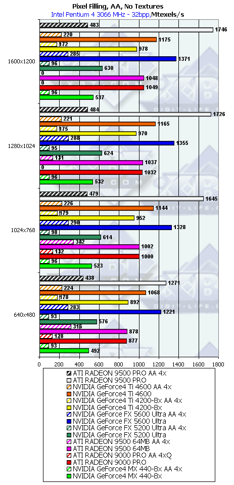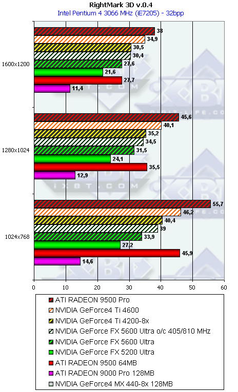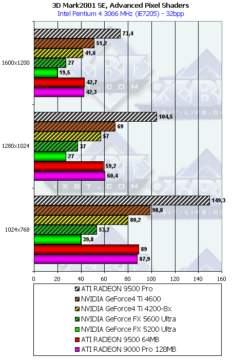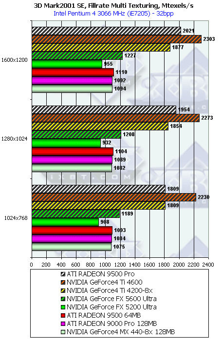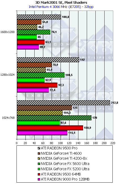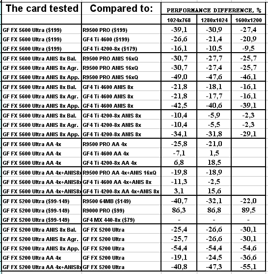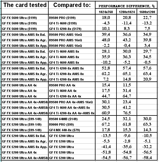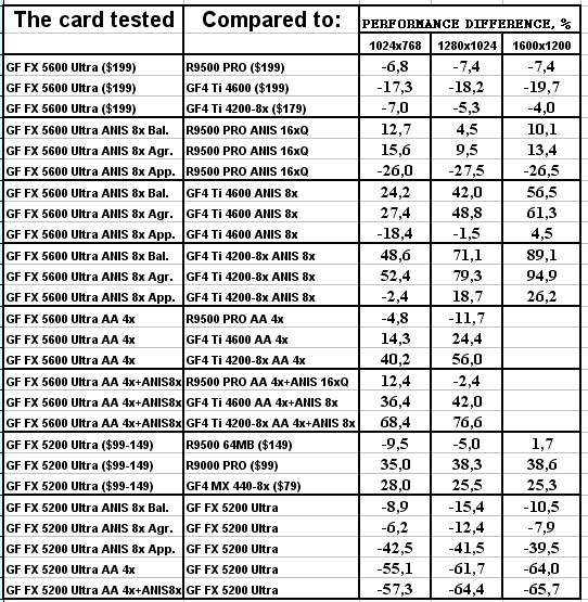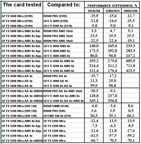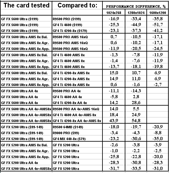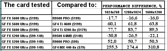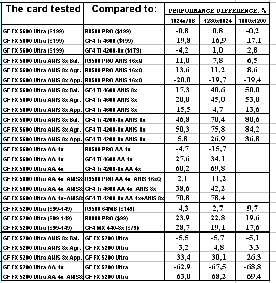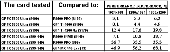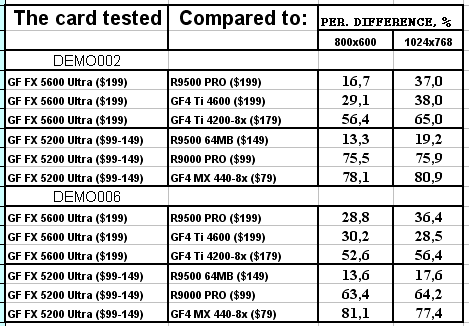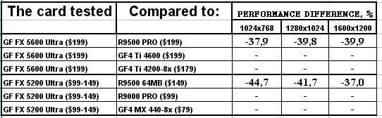 Думаю, что в таблицах соотношений все данные имеются, поэтому комментировать нет смысла. Замечу лишь, что мы провели сравнение GeForce FX 5200 Ultra и с RADEON 9500 64MB, хотя по позиционированию эти карты находятся в разных секторах. Однако начальная цена самой дорогой карты FX 5200 Ultra возможно будет до $149, а ныне по таким ценам можно купить RADEON 9500 64MB.