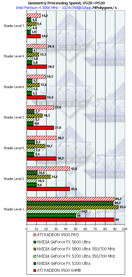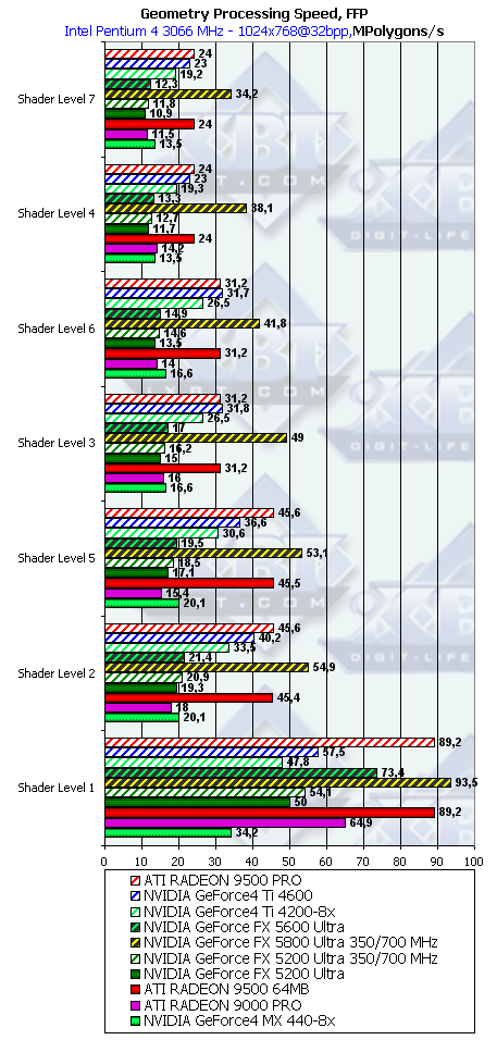 - Аппаратный геометрический процессор NV31 и NV34 имеет одинаковую (!) вычислительную производительность, меньшую более чем вдвое по сравнению с NV30. Все отличия между NV31 и NV34 в плане скорости обработки геометрии обусловлены контроллерами памяти, КЭШами и размером внутренних очередей.