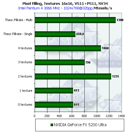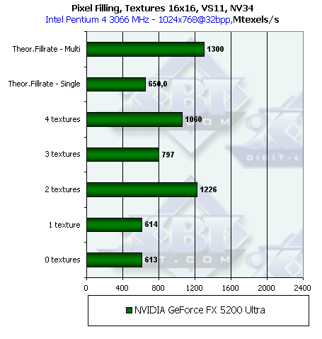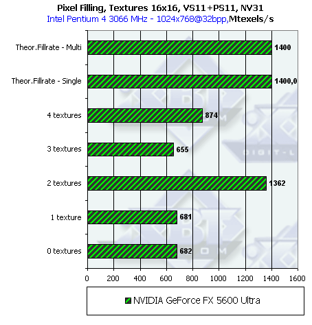 В NV31 удалось компенсировать самый спорный момент NV30 — этот чип может работать как в конфигурации 4х1, так и в конфигурации 2х2 в зависимости от числа текстур и задачи. Таким образом, NVIDIA исправила серьезный недостаток NV30, потенциально влияющий на производительность в старых и современных приложениях интенсивно накладывающих одну текстуру.