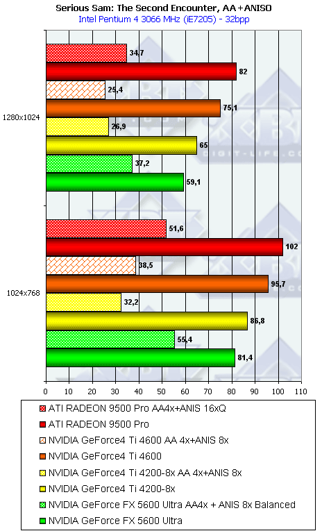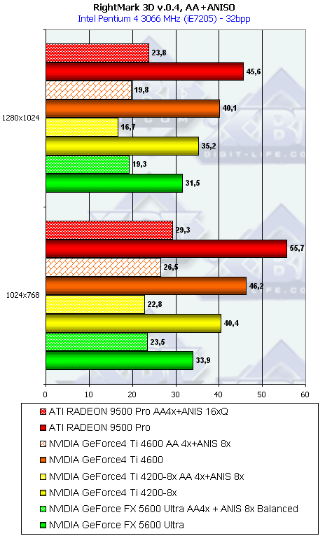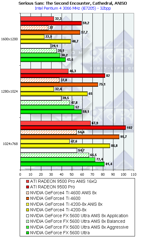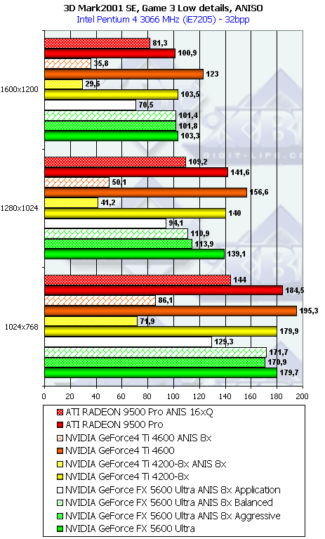 Сразу отмечу, почему мы использовали в наших тестах настройки анизотропии 16х у карт от ATI и 8х у карт от NVIDIA. Никакой дискриминации в отношении карт от ATI нет! Алгоритмы работы этой функции у ATI и NVIDIA очень различаются (об этом мы говорили подробно в нашем материале по NV30), поэтому сопоставлять только цифры "8" неразумно. Критерий один: максимально возможное качество. У NVIDIA по ее "счетчику" — это 8х, а у ATI — 16х. Скриншоты мы уже приводили, и не один раз. К тому же, интересно будет узнать, как сопоставляются разные режимы работы анизотропии (Application, Balanced, Aggressive) от NVIDIA с максимально качественным режимом от ATI, тем более, что опять же, скриншоты мы уже приводили, и читатель может оценить соотношение скорости и качества (милости просим в обзор NV30 за скриншотами оценки качества анизотропной фильтрации).