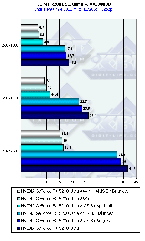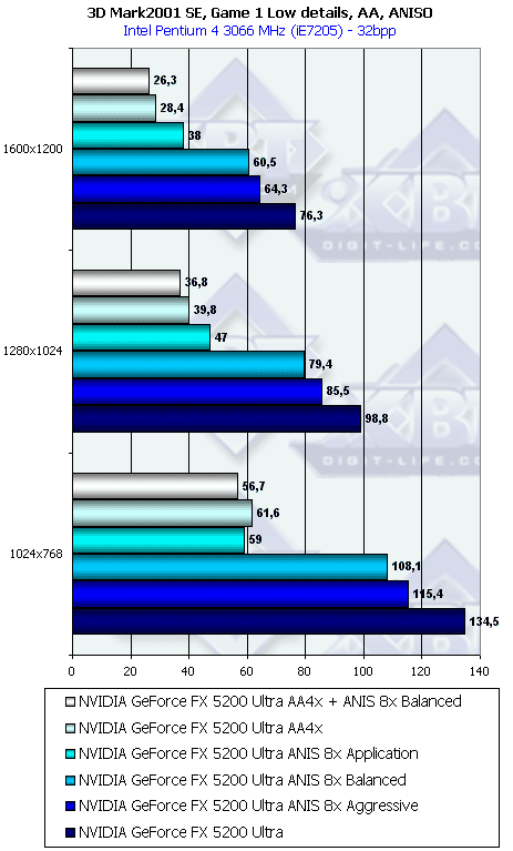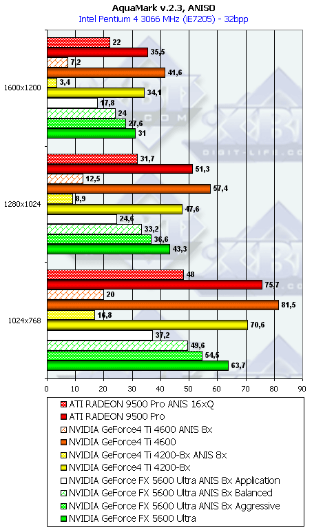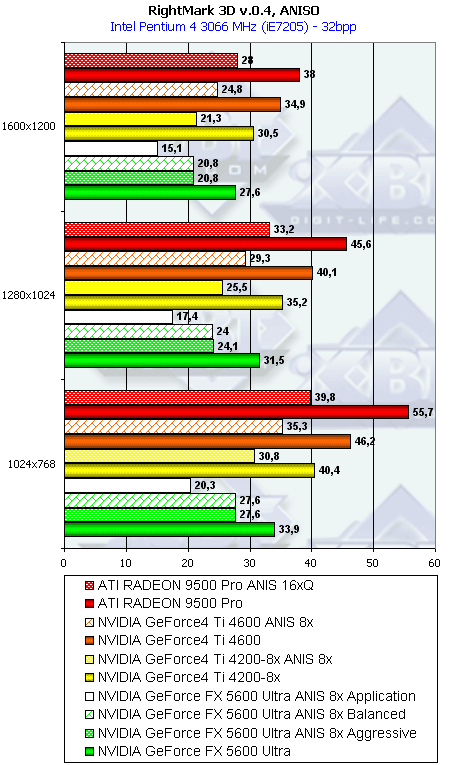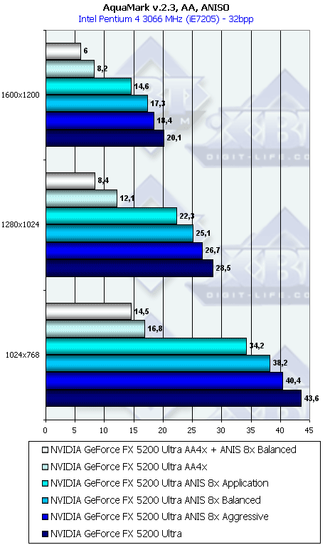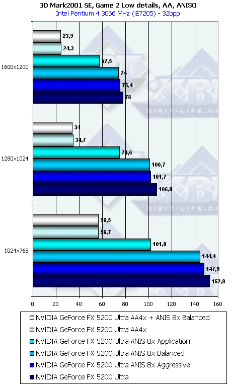 Напомню, что у всех группы NV3x есть по сути три разновидности анизотропной фильтрации: зависящая от приложения, сбалансированная между производительностью и качеством и агрессивная в плане предпочтения производительности качеству. По умолчанию используется сбалансированная разновидность. Мы тестировали скорость как этого подвида, так и "агрессивного". Замечу, что в разных версиях драйверов название режима Aggressive может заменяться на Performance.