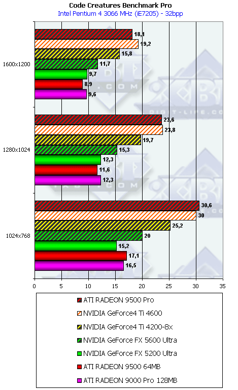 - Code Creatures Benchmark Pro (CodeCult) игровой тест, демонстрирующий работу платы в DirectX 8.1, Shaders, HW T&L.