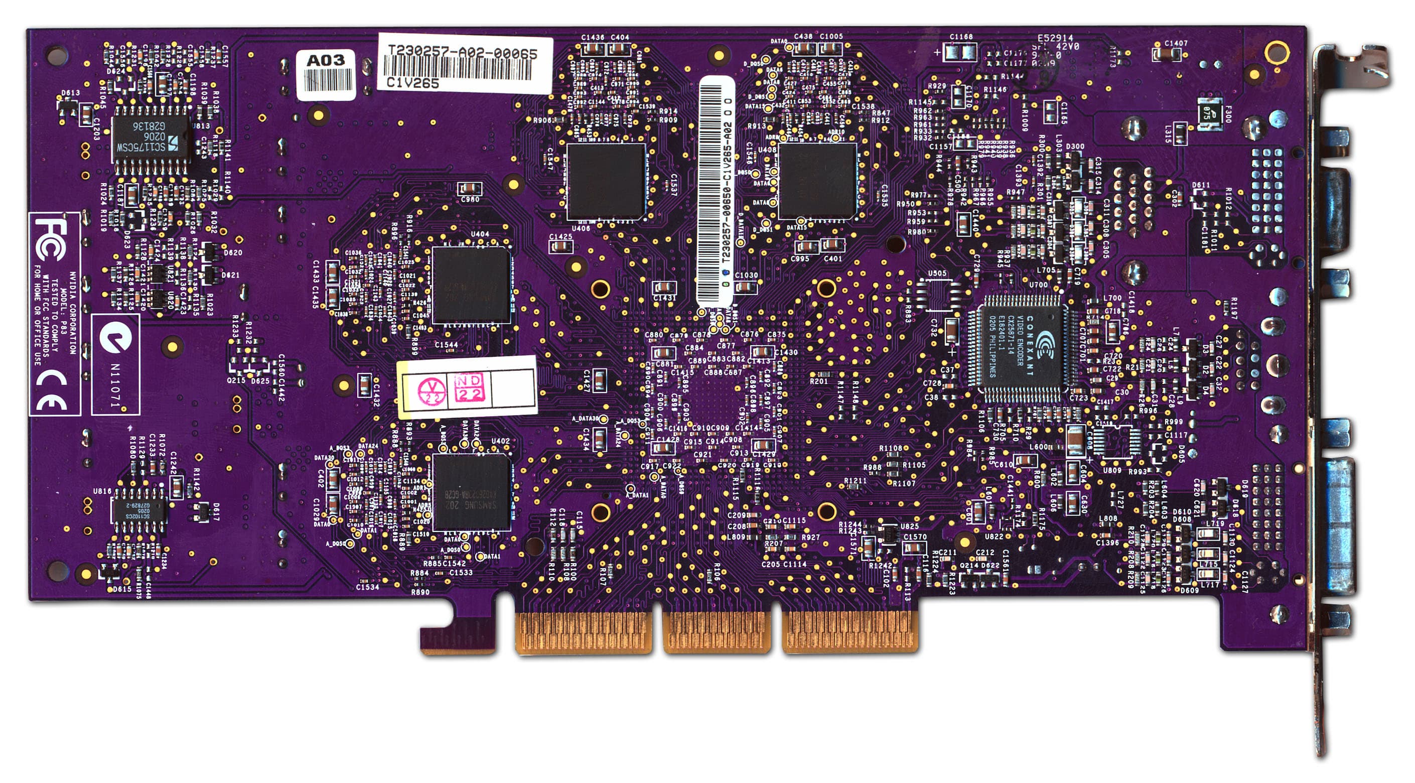 | На картах установлены микросхемы памяти Hynix марки HY5DU283222-AF25, форм-фактора BGA. Максимальная частота работы — 400 (800) МГц, время выборки 2.5 нс. По умолчанию память работает у GeForce FX 5600 Ultra на частоте 350 (700) МГц, у GeForce FX 5200 Ultra — 325 (650) МГц. | ![]() |