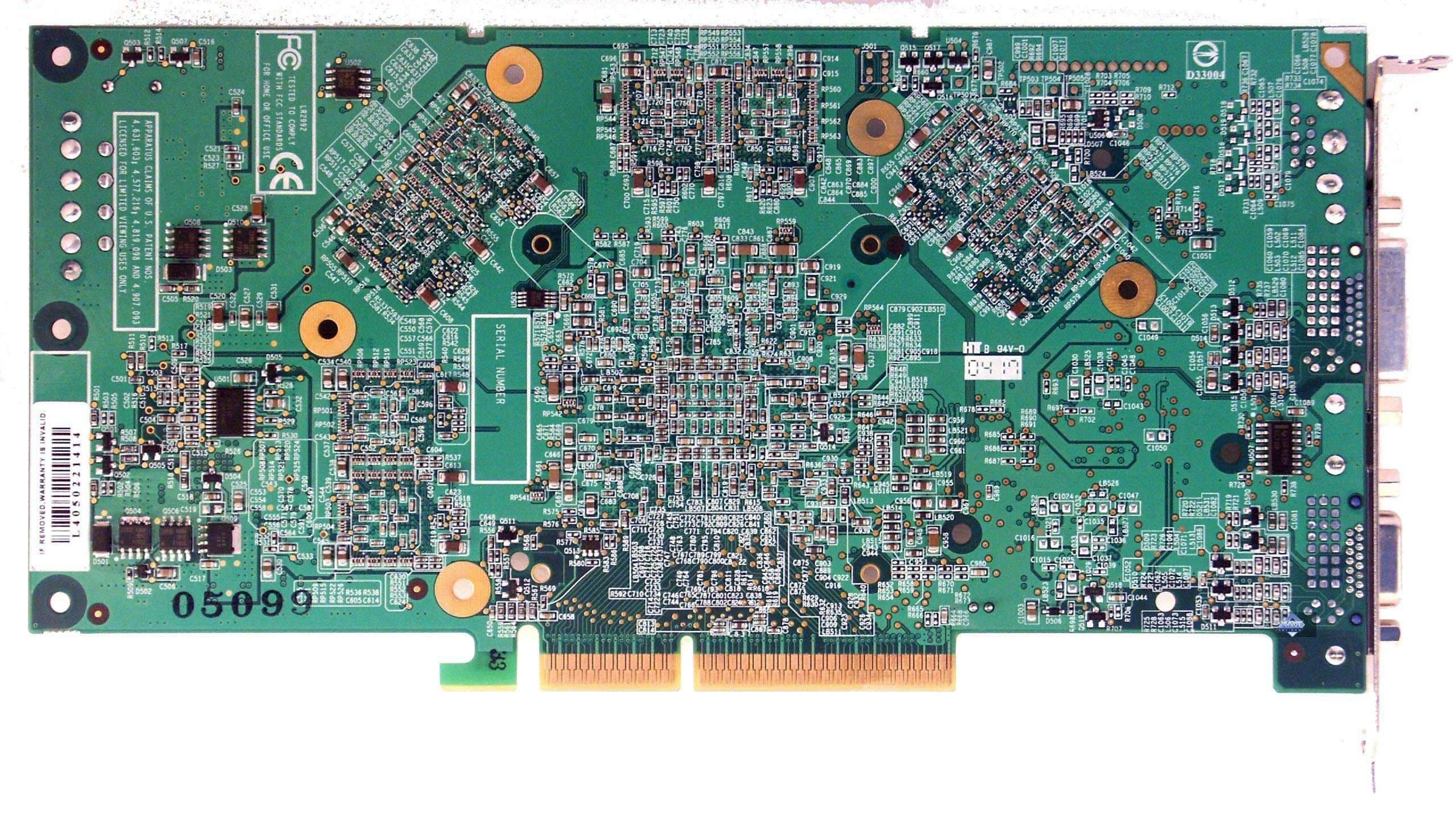 | Карта имеет интерфейс AGP x8/x4, 256 МБ памяти GDDR3 SDRAM размещенной в 8-ми микросхемах на лицевой стороне PCB. Микросхемы памяти Samsung (GDDR3). Время выборки у микросхем памяти 2.0 ns, что соответствует частоте работы 500 (1000) МГц, память же работает на частоте 550 (1100) МГц (РАЗГОН! Прошу обратить внимание, что память работает на частотах выше своего номинала. Очень может быть, что просто на нее подали более высокое напряжение.. Частота работы GPU 425 MHz (Также внимание! Это первый случай, когда мы встретили серийную карту с частотой работы ядра выше того, что было на reference card). Шина обмена с памятью — 256 bit. Число пиксельных конвейеров — 16 (4х4). | ![]() |