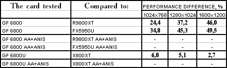 Если с GeForce 6800 Ultra все понятно: ему конкурент только RADEON X800 XT, то GeForce 6800 при его номинальной цене в 299 долларов США (реально от 320 до 400 на конец июня) пока не имеет конкурента от ATI из серии X800. Но, учитывая, что ныне мы видим цены на 9800 XT и 5950 Ultra выше 400 долларов, очень интересно сравнить новинку именно с этими картами. То есть, есть шанс, что вышеперечисленные RADEON 9800 XT и особенно FX 5950 Ultra уже пора или убирать с прилавков, или снижать цены на 30-50%.