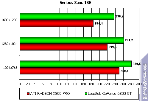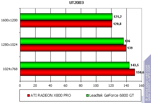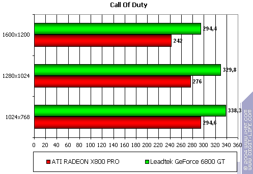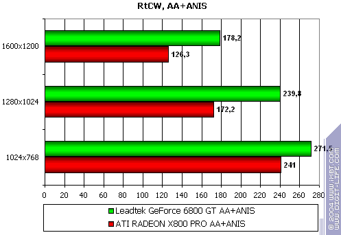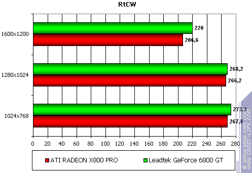 - Leadtek WinFast A400 GT TDH против ATI RADEON X800 PRO уверенное лидерство у первого. Впрочем, мы давно уже наблюдаем явный перевес у всех продуктов NVIDIA в данной игре. Что поделать, OpenGL всегда давался этой компании лучше, и скорости были выше, чем у конкурентов.