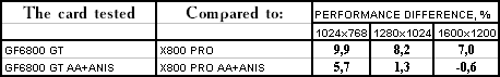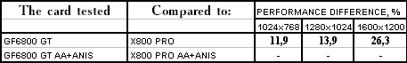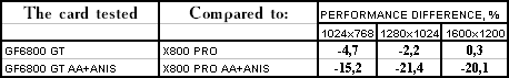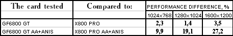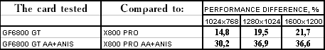 - Leadtek WinFast A400 GT TDH против ATI RADEON X800 PRO все же присудим небольшой перевес у 6800GT, поскольку скорости уже таковы, что использовать вместе АА и анизотропию можно, но осторожно :).