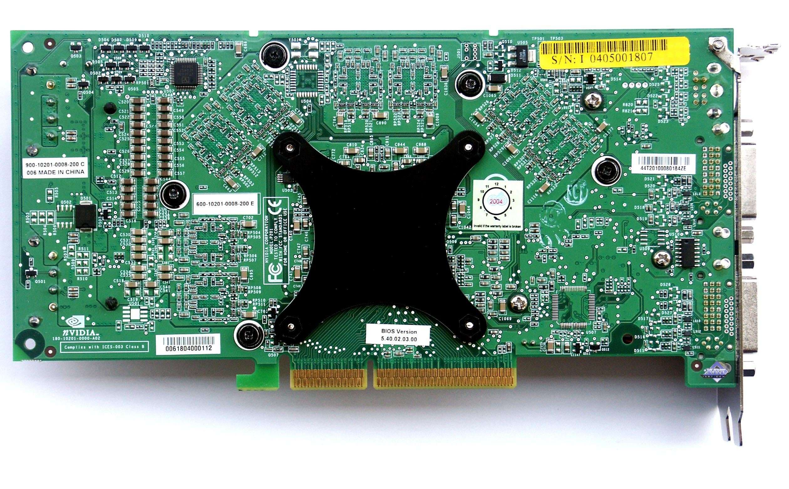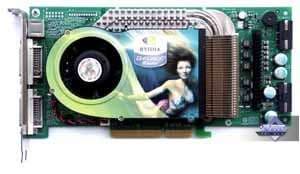 | Карта имеет интерфейс AGP x8/x4, 256 МБ памяти GDDR3 SDRAM, размещенной в 8-ми микросхемах на лицевой стороне PCB. Микросхемы памяти Samsung (GDDR3). Время выборки у микросхем памяти 1.6 ns, что соответствует частоте работы 625 (1250) МГц, память же работает на частоте 550 (1100) МГц. Частота работы GPU 400 MHz. Шина обмена с памятью — 256 bit. | ![]() |