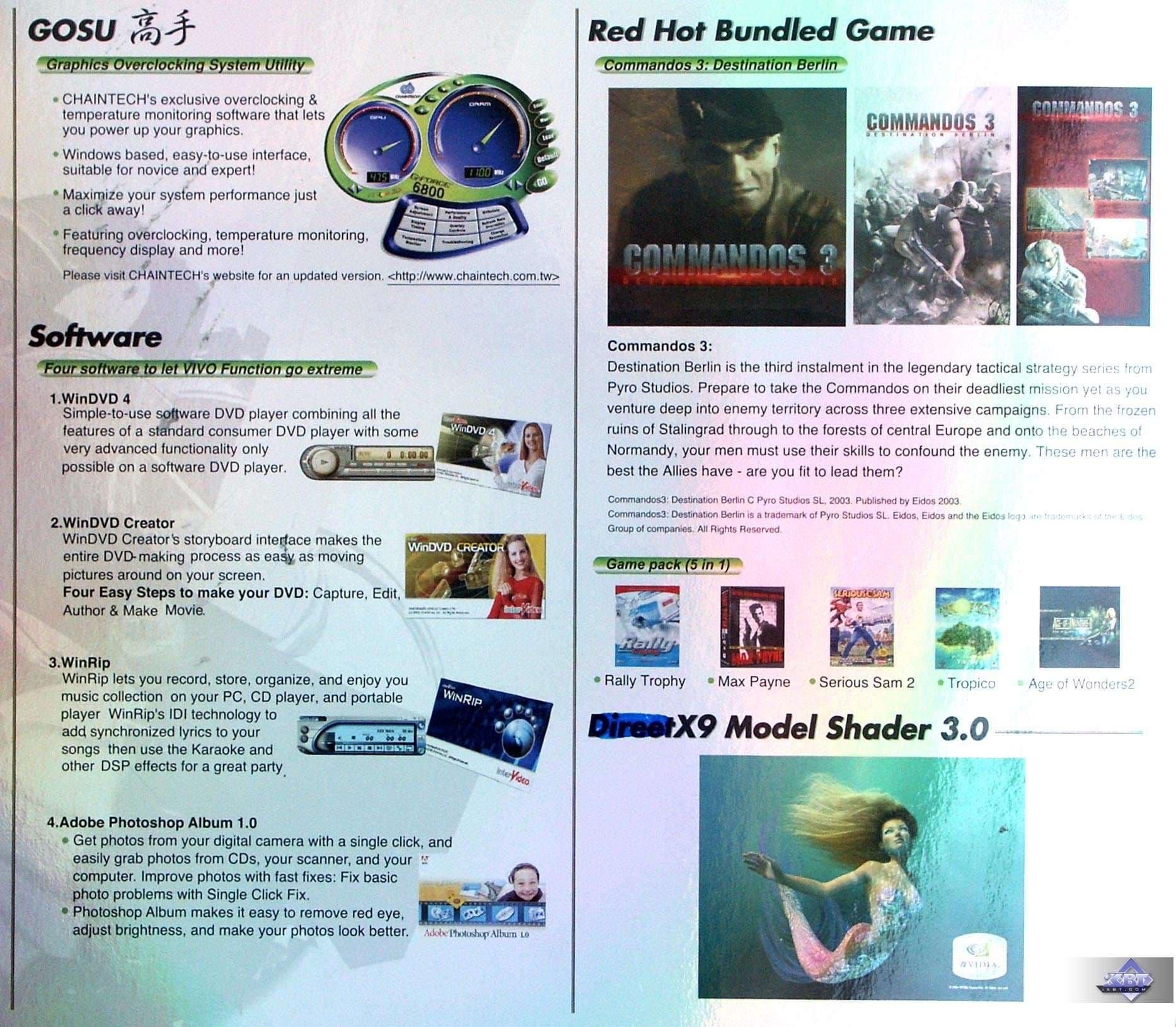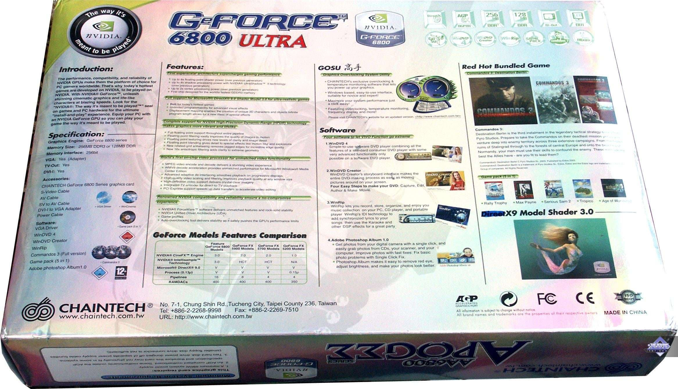 Что касается видеокарты от Chaintech, то перед нами просто положенная в нарядную коробку и снабженная играми и сувенирами reference card, ведь никаких отличий нет, и инженеры компании пока никак не проявили себя. Есть данные, что вышла в свет карта GeForce 6800, которая уже исполнена самим Chaintech, со своим дизайном. В ближайшее время мы ее постараемся ее изучить.