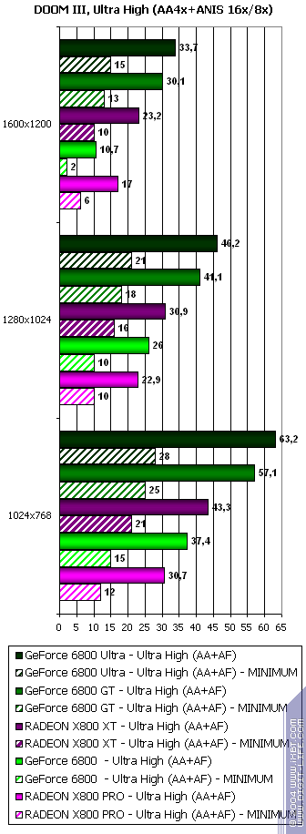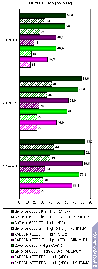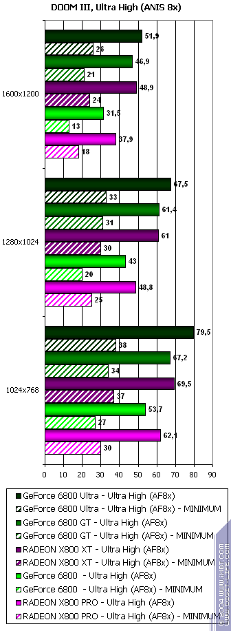 Думаю, что 99% пользователей или не в курсе такого « патча» , или им его ставить страшно/принципиально не хочется/лень (выбрать по вкусу). Поэтому все равно ориентируемся на диаграммы, которые приведены выше с левой стороны. А там и так цифры говорят сами за себя, успех в DOOM III у GeForce 6800 всех мастей сногсшибательный.