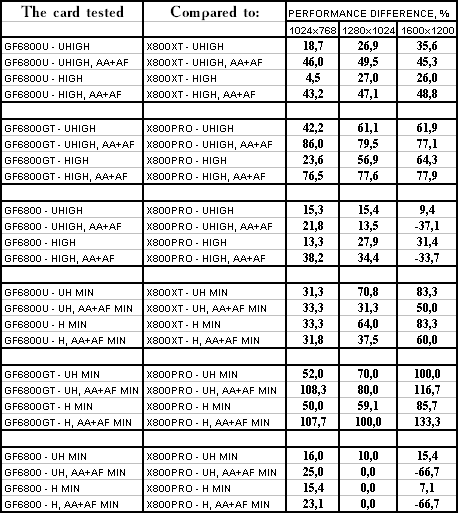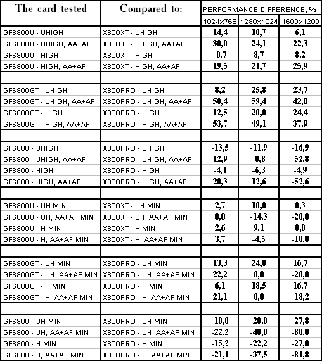 Очевидно, что скорость у X800 выросла, особенно в тяжелых режимах с АА и АФ. Но самое интересное то, что производительность GeForce 6800 упала от «патча»! Хотя представители NVIDIA уверяли ранее, что внесенные Humus-ом изменения как раз на руку GeForce-ам, и что скорость вырастет намного больше, чем у X800.