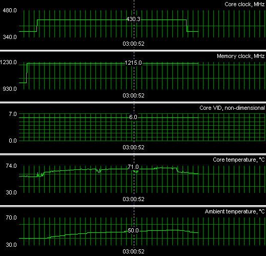 Как мы видим, охлаждение очень эффективно! Температура на ядре не достигала даже 70 градусов. А теперь поставим разгон на 430/1215 МГц. И посмотрим, опять же, БЕЗ ДОПОЛНИТЕЛЬНОГО охлаждения, как справится с этой задачей кулер.