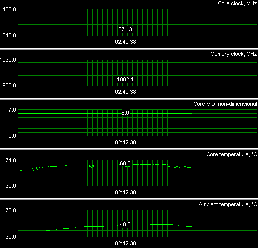 Прекрасный результат! Температура лишь чуть-чуть выросла. (Отмечу, что в обоих случаях прогонялись игровые тесты из 3DMark05). Да и разгон очень хорош, превышающий даже GeForce 6800 Ultra.