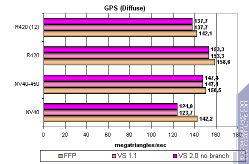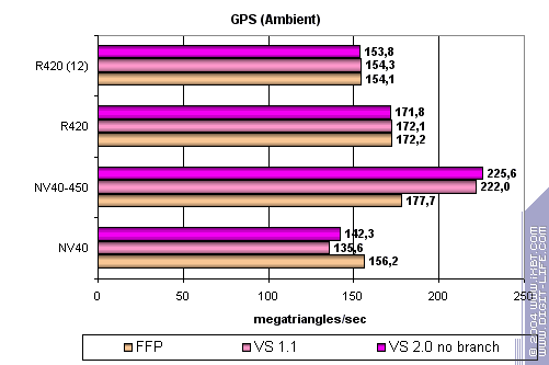 Здесь NV40 FFP лидер, несмотря на частотное преимущество ATI. Но общая картина по-прежнему скалывается скорее в пользу ATI — выше частота ядра — больше скорость вершинных шейдеров.
