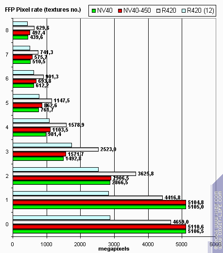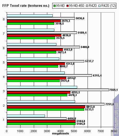 А сейчас — скорость закраски буфера кадра (fillrate, pixelrate), режим FFP, для разного числа текстур накладываемых на один пиксель: